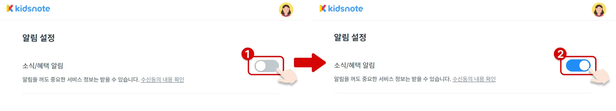 - 알림 설정을 ①비활성화 하면 키즈노트의 유용한 소식과 각종 혜택 정보를 받아보실 수 없습니다.