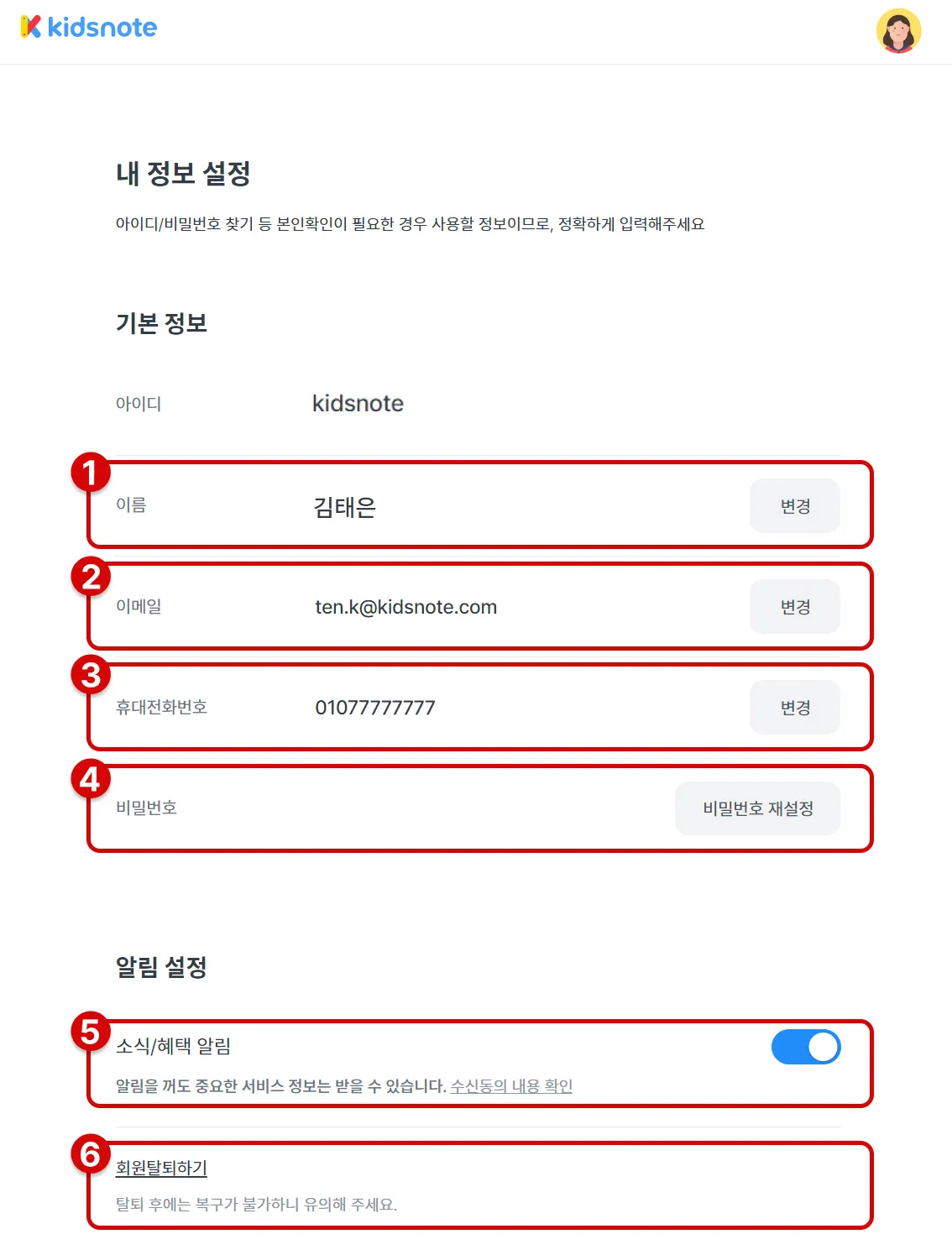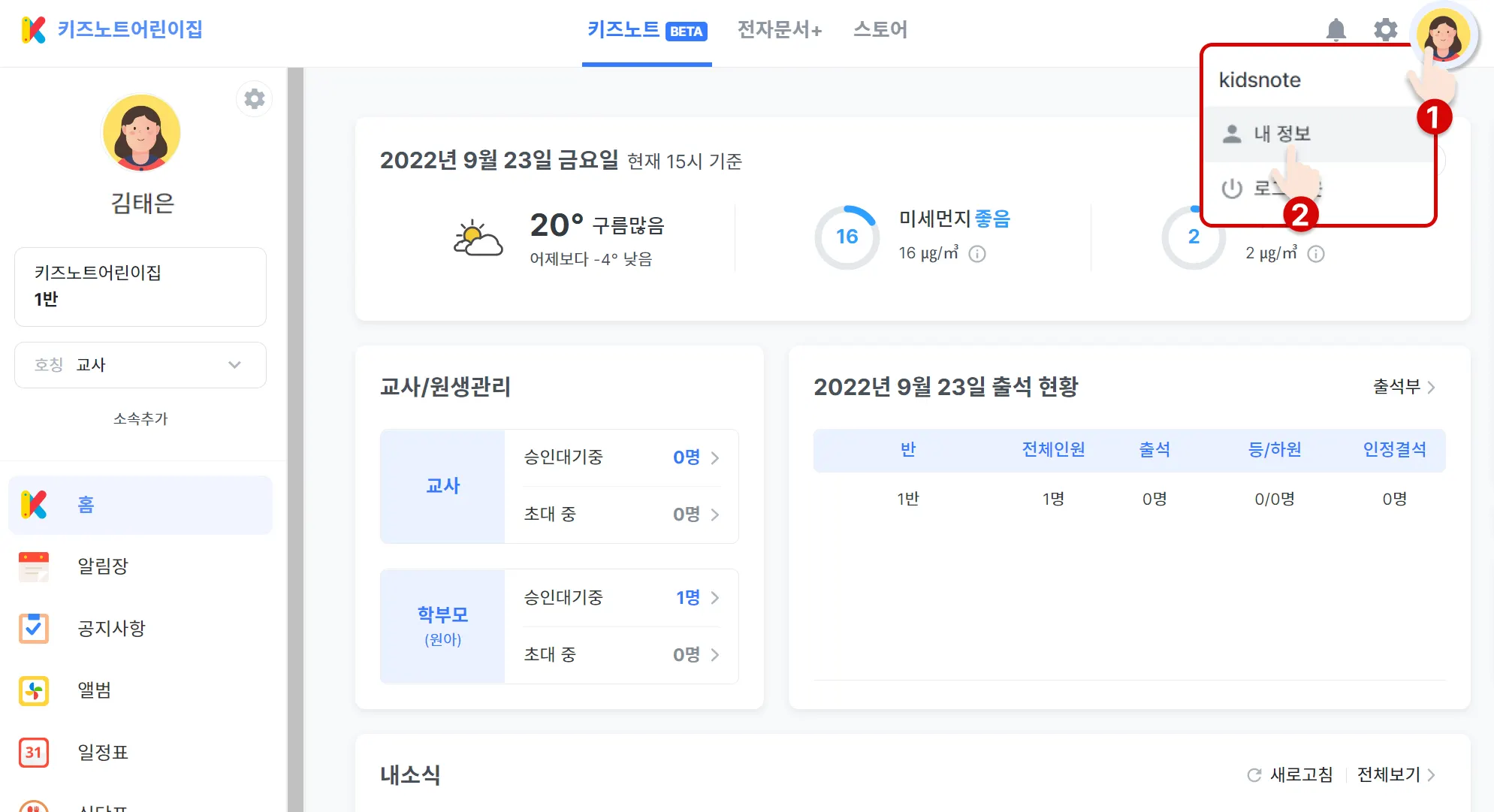 키즈노트 웹사이트에 로그인 후, 우측 사용자 ①아이콘 클릭 > ②내 정보 를 선택합니다.