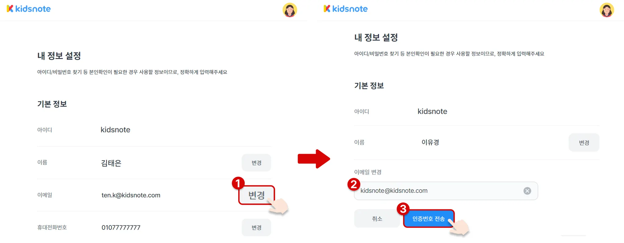 이메일 변경을 원하시면 ①변경 버튼을 선택 > ②변경할 이메일주소 입력 > ③인증번호 전송 버튼을 누릅니다.