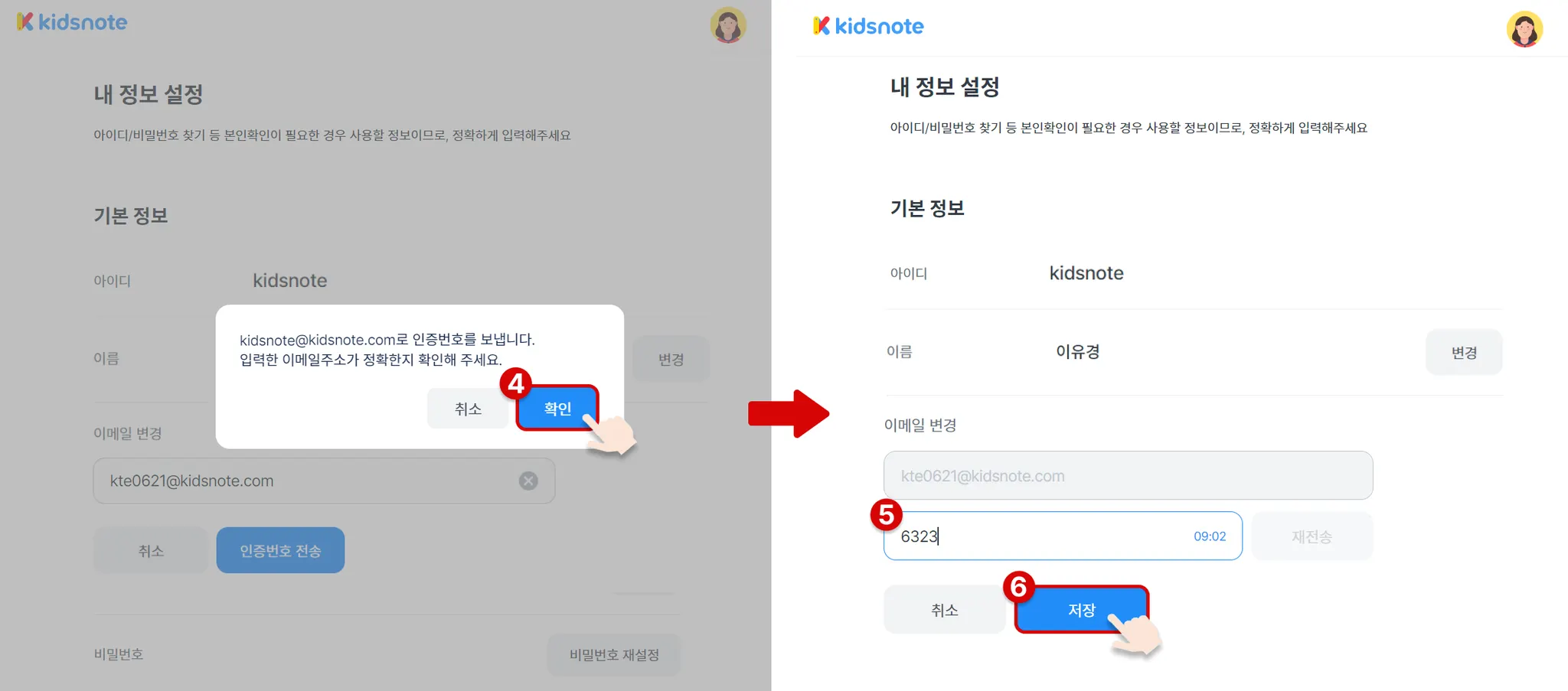 정확한 이메일주소 확인 후, ④확인 버튼을 선택 > 변경할 이메일에서 4자리 ⑤인증번호 입력 > ⑥저장 버튼을 누르면 변경이 완료됩니다.
