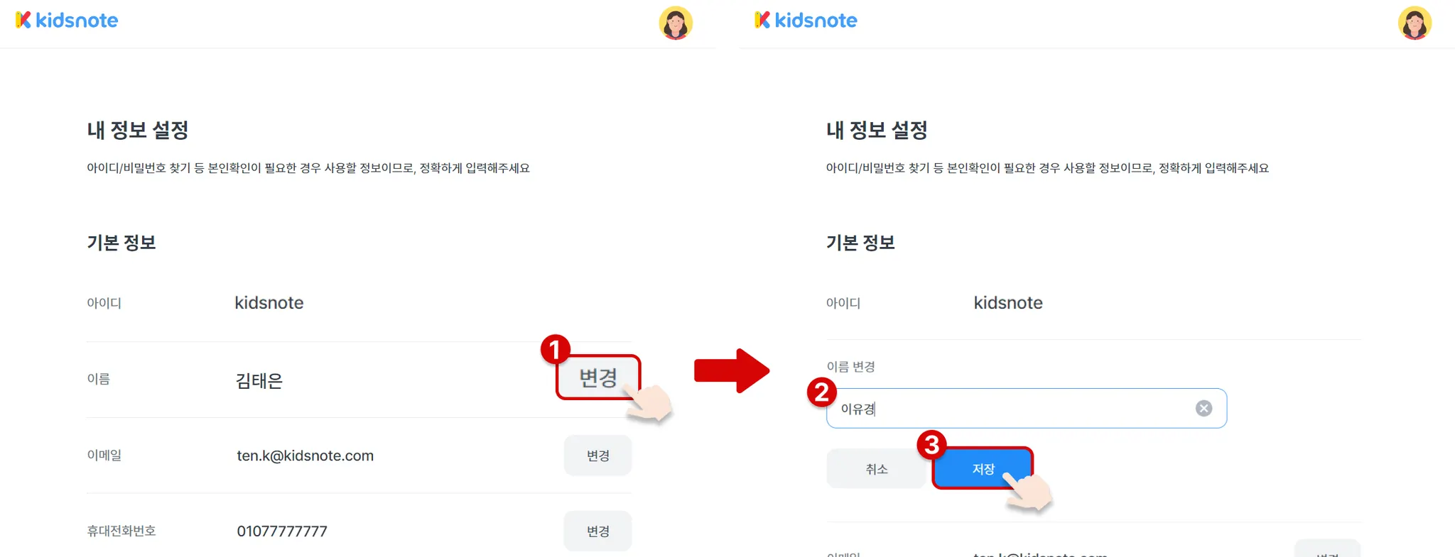 이름 변경을 원하시면 ①변경 버튼을 선택 > ②변경할 이름 입력 > ③저장 버튼을 누르면 변경이 완료됩니다.