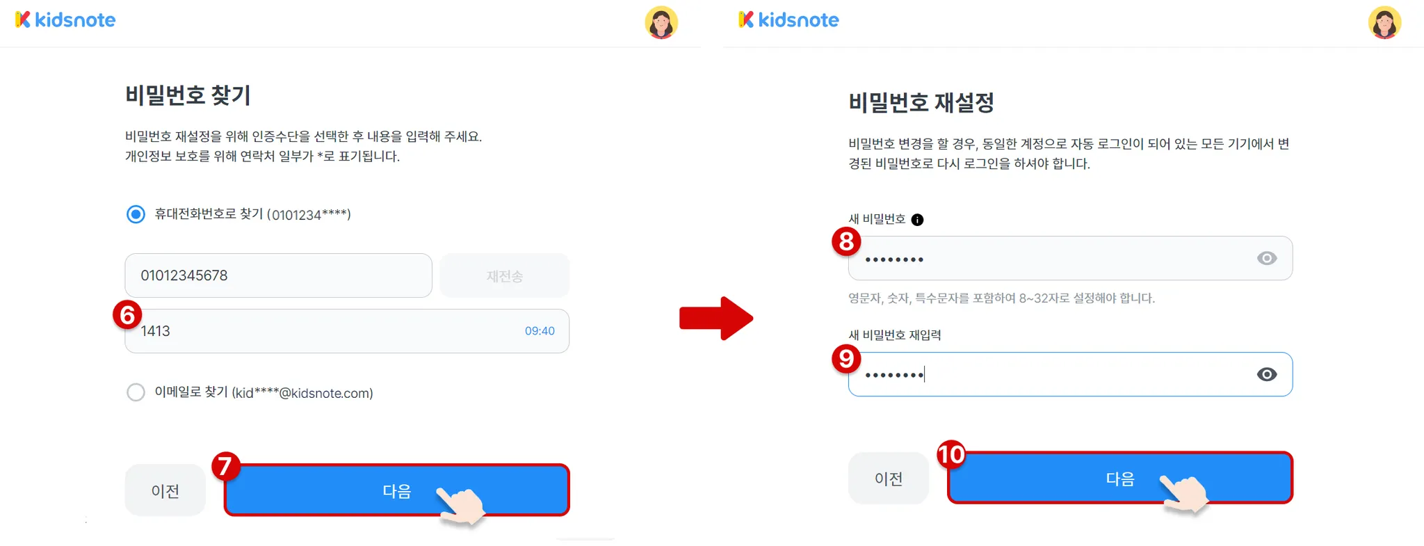 비밀번호 재설정 페이지에서 ⑧새 비밀번호 /⑨새 비밀번호 재입력 후 ⑩다음버튼을 누르면 변경이 완료됩니다.