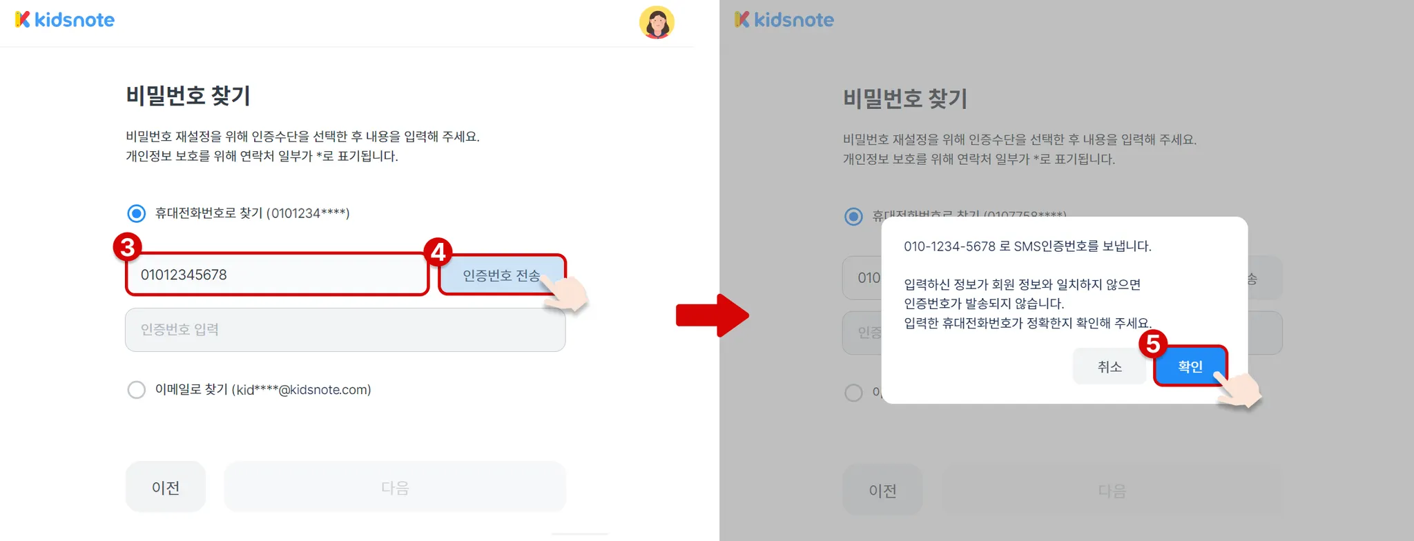 인증 방법 선택에 따라 ③휴대전화번호/이메일주소 입력 > ③인증번호 전송 버튼을 누른 후 ⑤확인 버튼을 선택합니다.