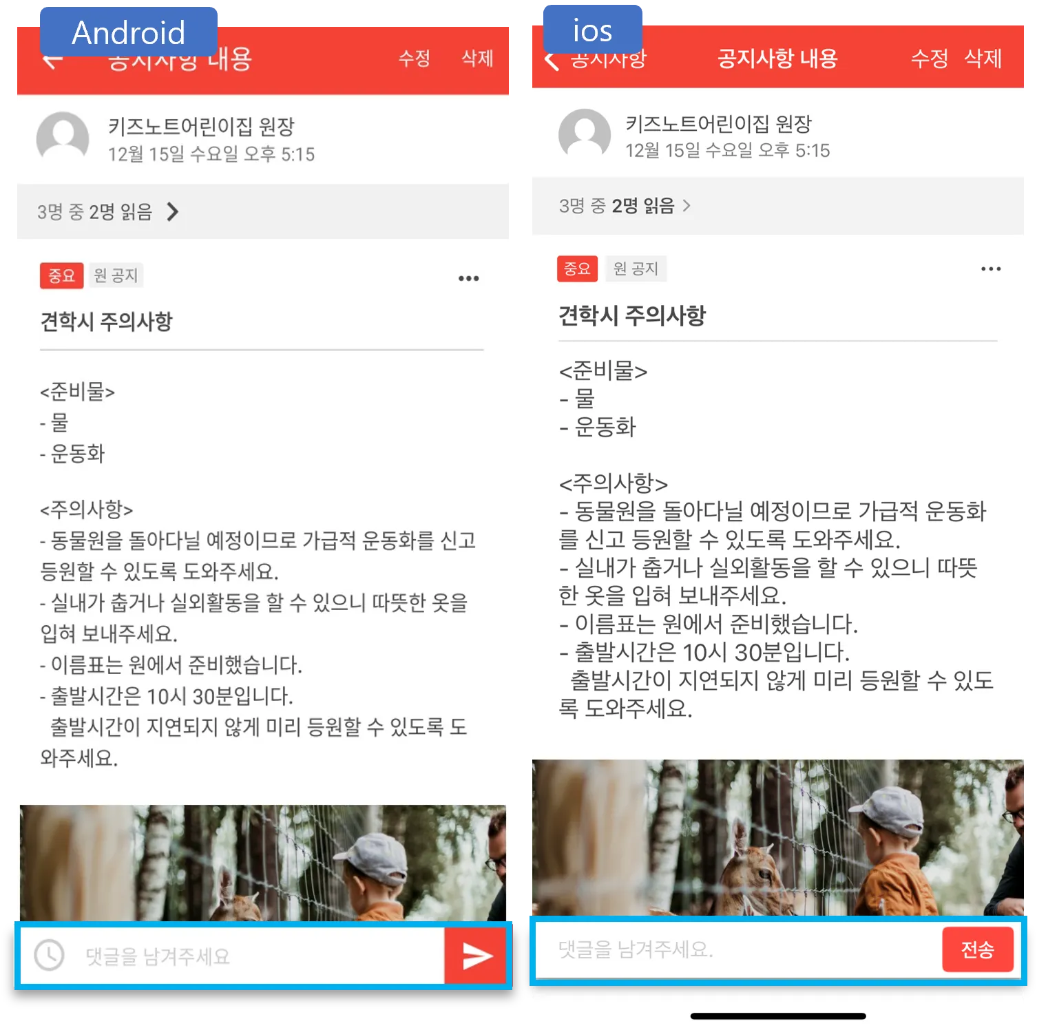 - 원 공지는 우리 원 모든 학부모님들간의 댓글 소통이 가능하고, 개별 반 공지는 각 반 별 학부모님들간의 댓글 소통만 가능합니다.
