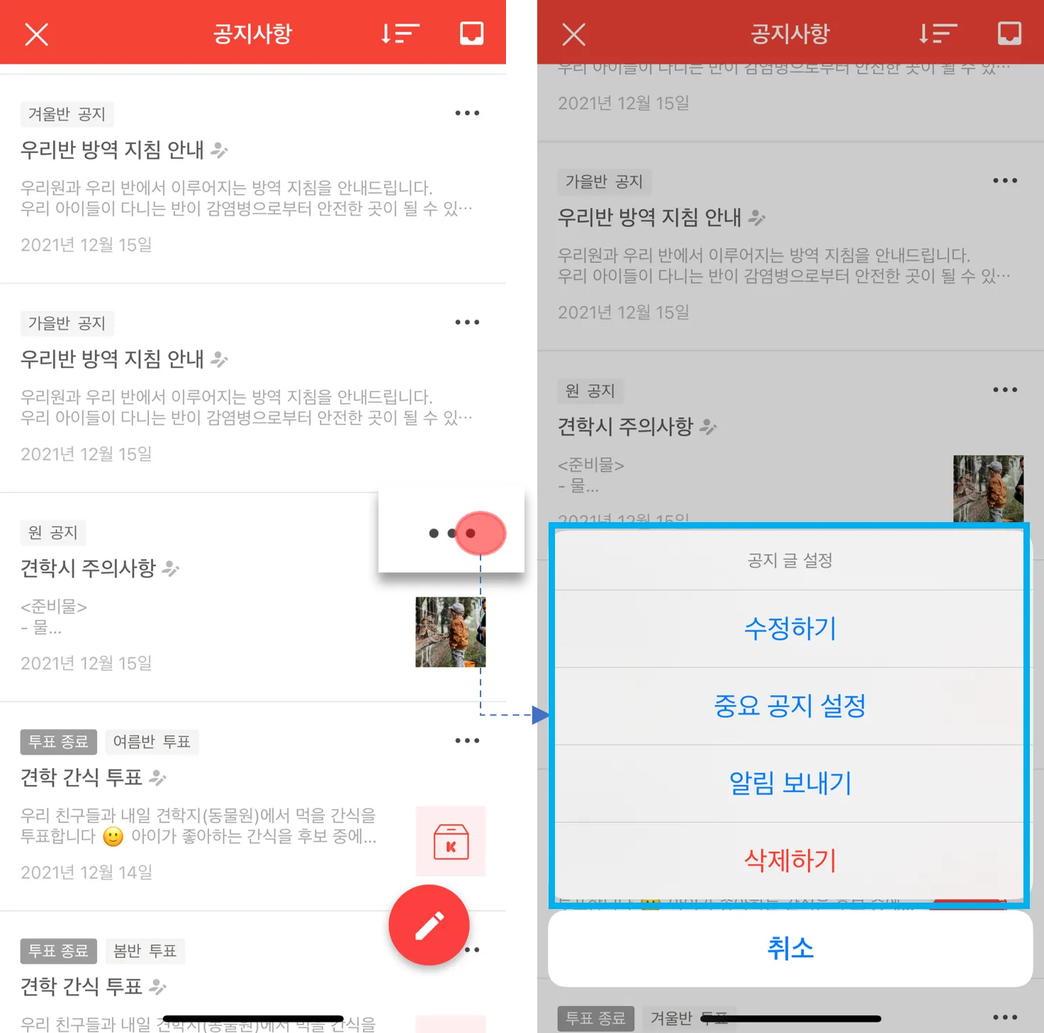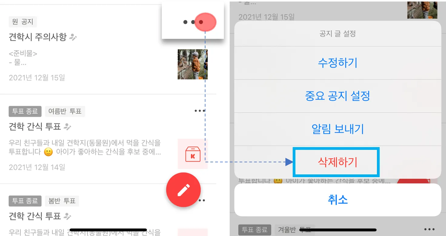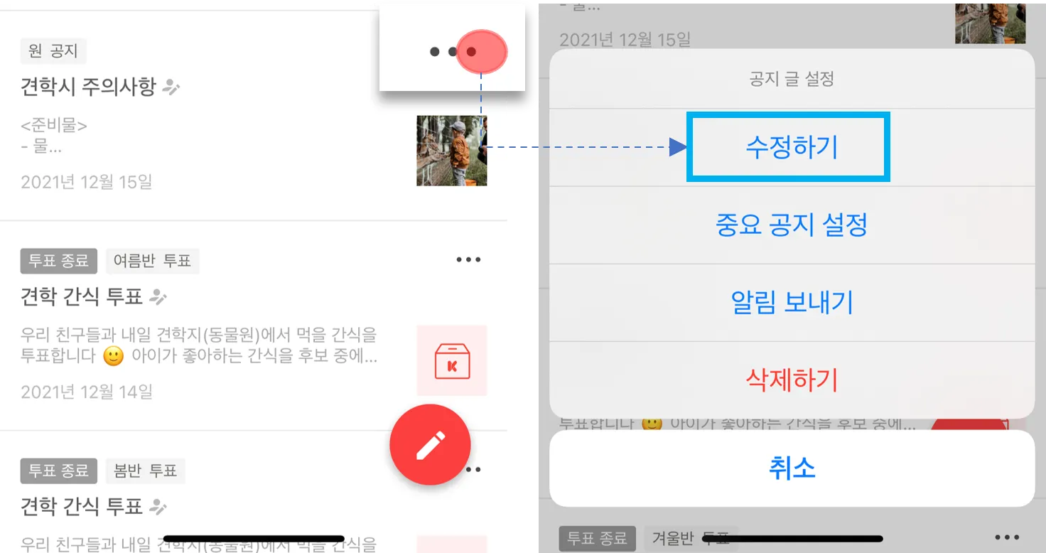 해당 글의 더보기 및 상세 페이지에서 공지 글을 수정할 수 있습니다. 원장님/선생님의 역할에 따라 수정 권한이 달라집니다.