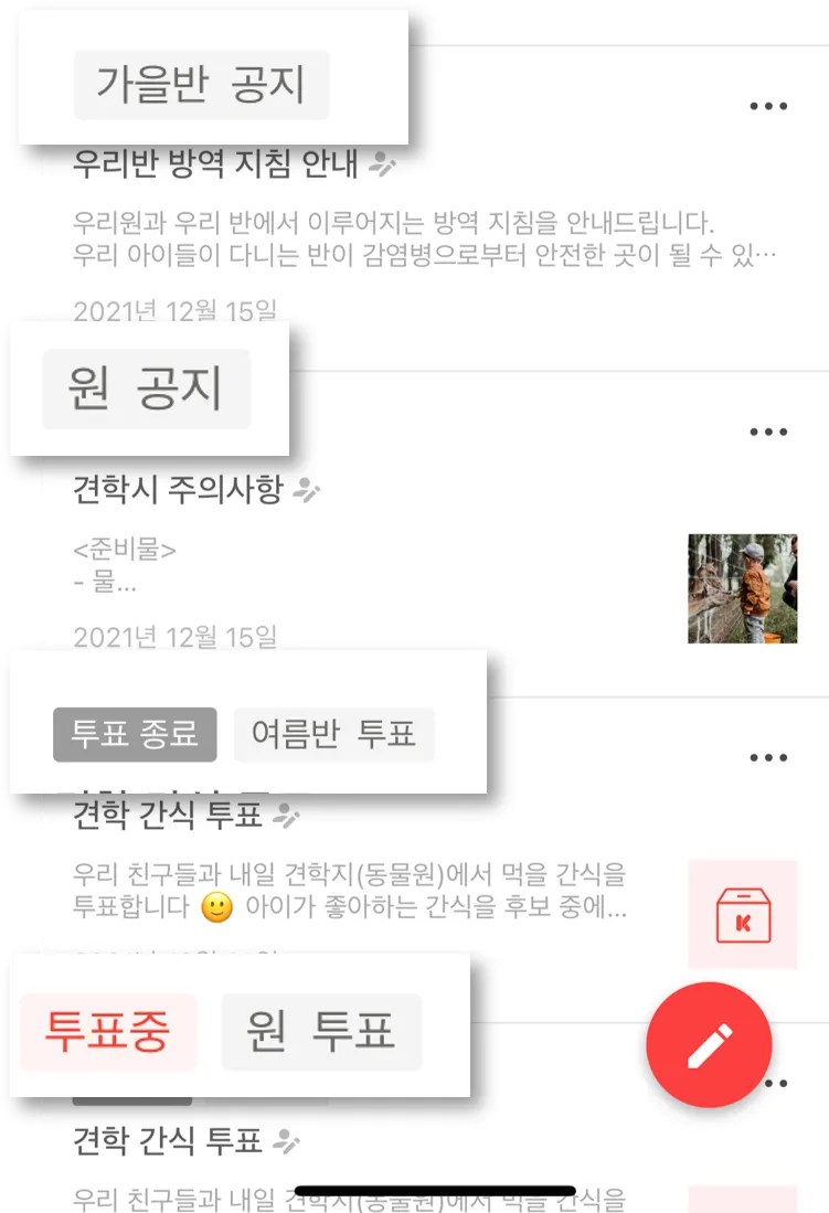 - 공지사항 목록에서는 원 공지와 개별 반 공지를 모두 볼 수 있습니다.