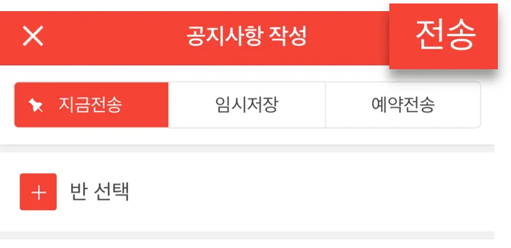원 전체 또는 반 대상으로 중요한 공지를 실시간으로 전달할 수 있습니다.