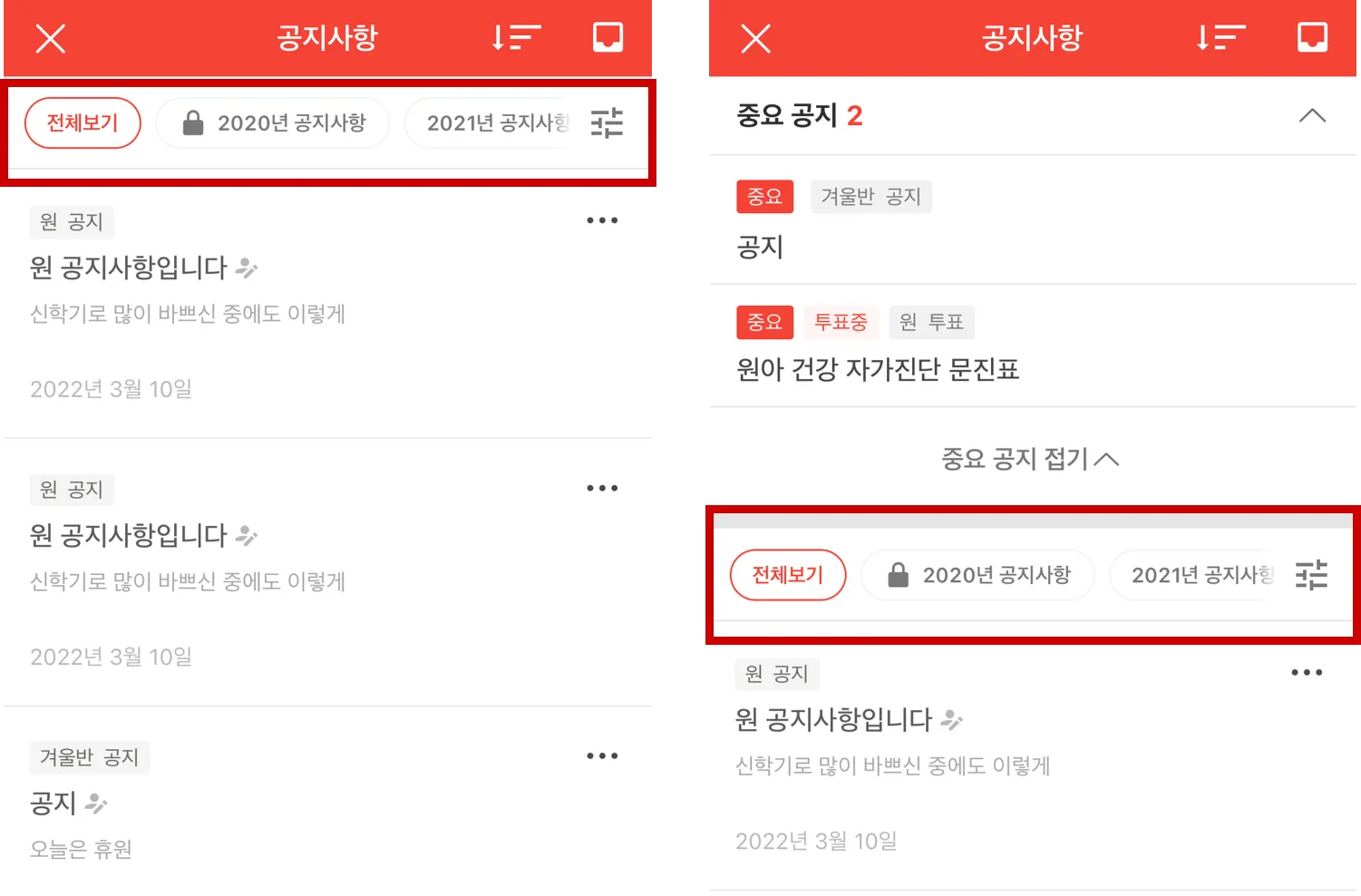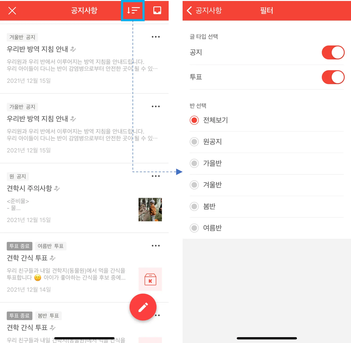 필터를 이용하여 글 타입별, 원/반 별로 공지 글을 볼 수 있습니다.