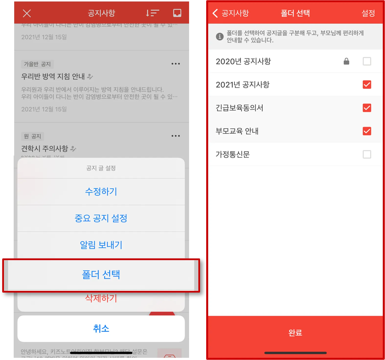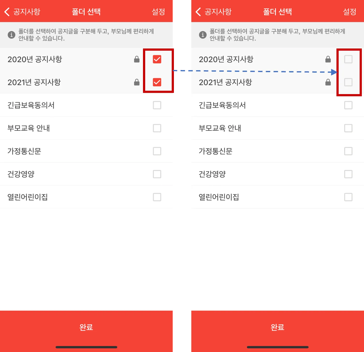 - 폴더를 비공개 설정하면, 학부모님에게는 비공개 폴더가 보이지 않습니다.
