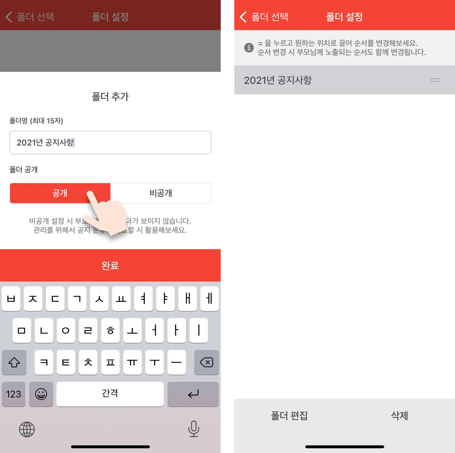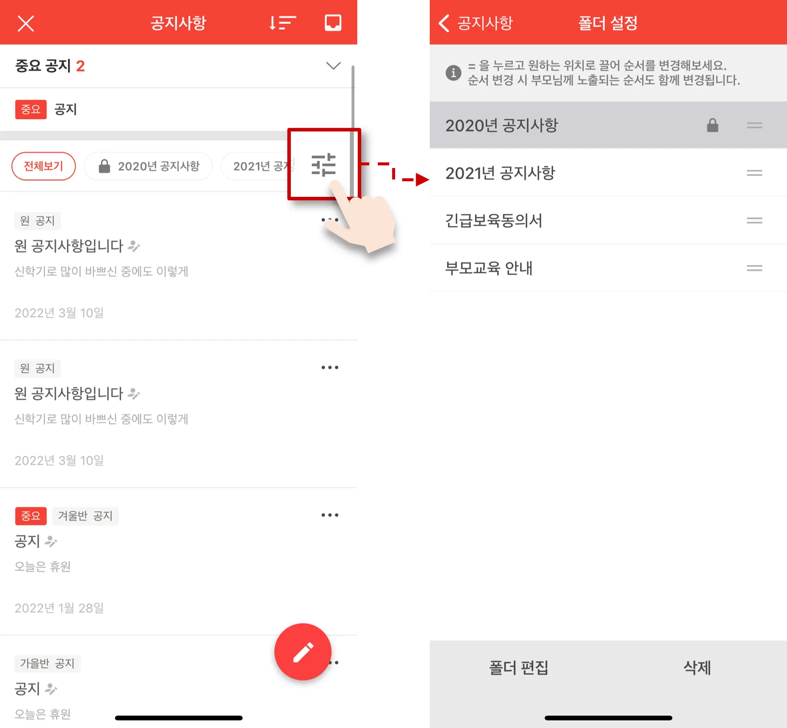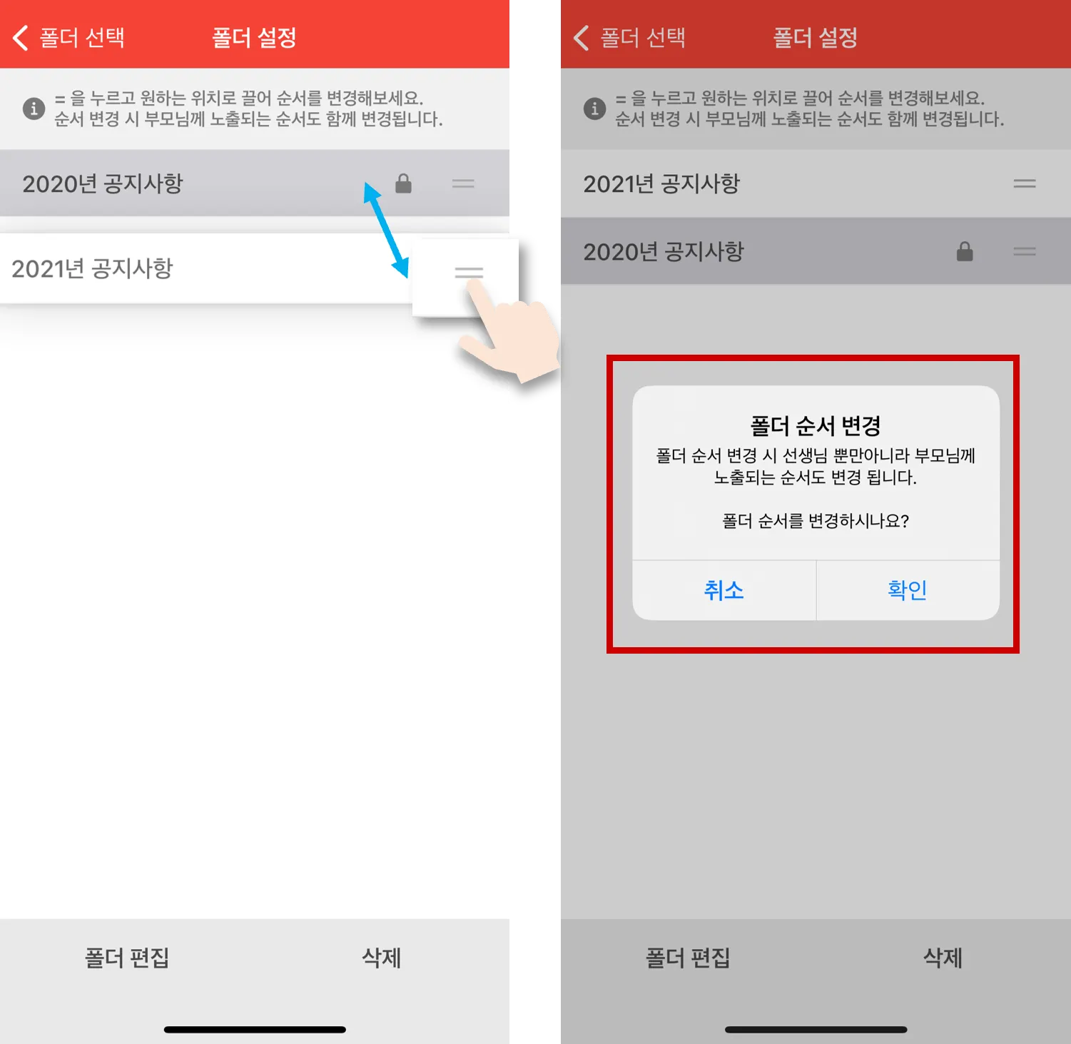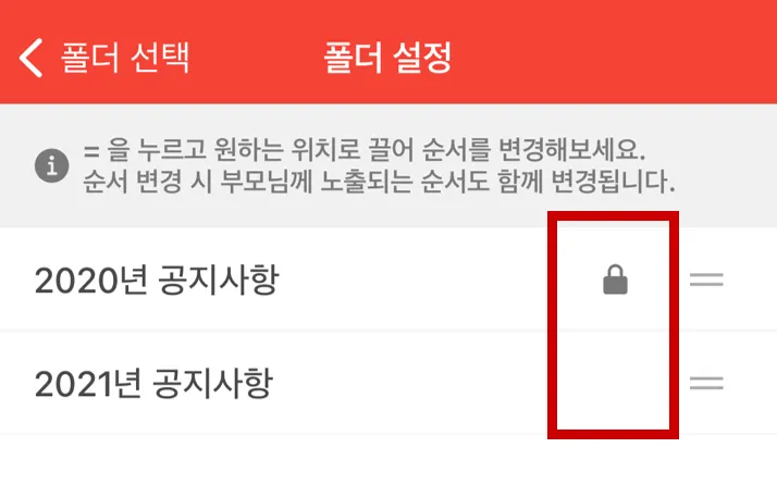 - 폴더 순서 변경 시 선생님, 학부모님께도 노출되는 순서가 변경됩니다.