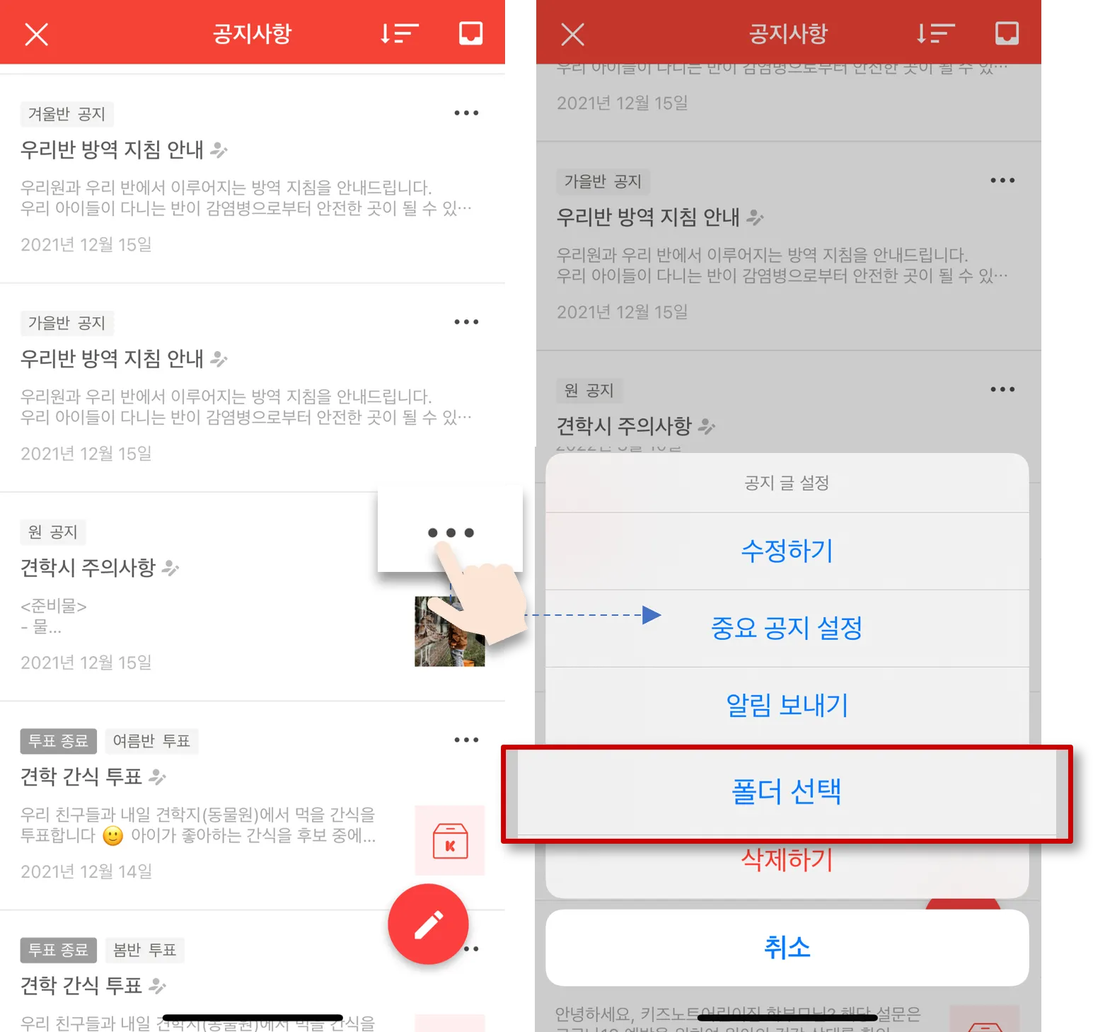 공지 목록에서 폴더를 선택할 글의 더보기를 클릭한 후, 폴더 선택을 눌러주세요.