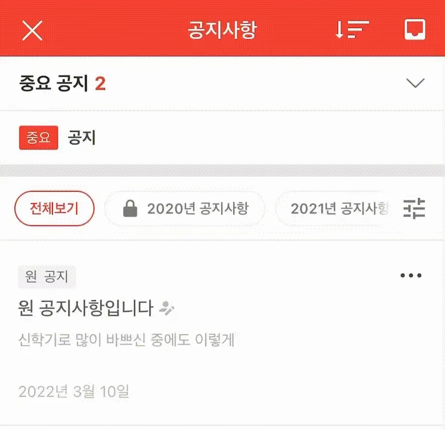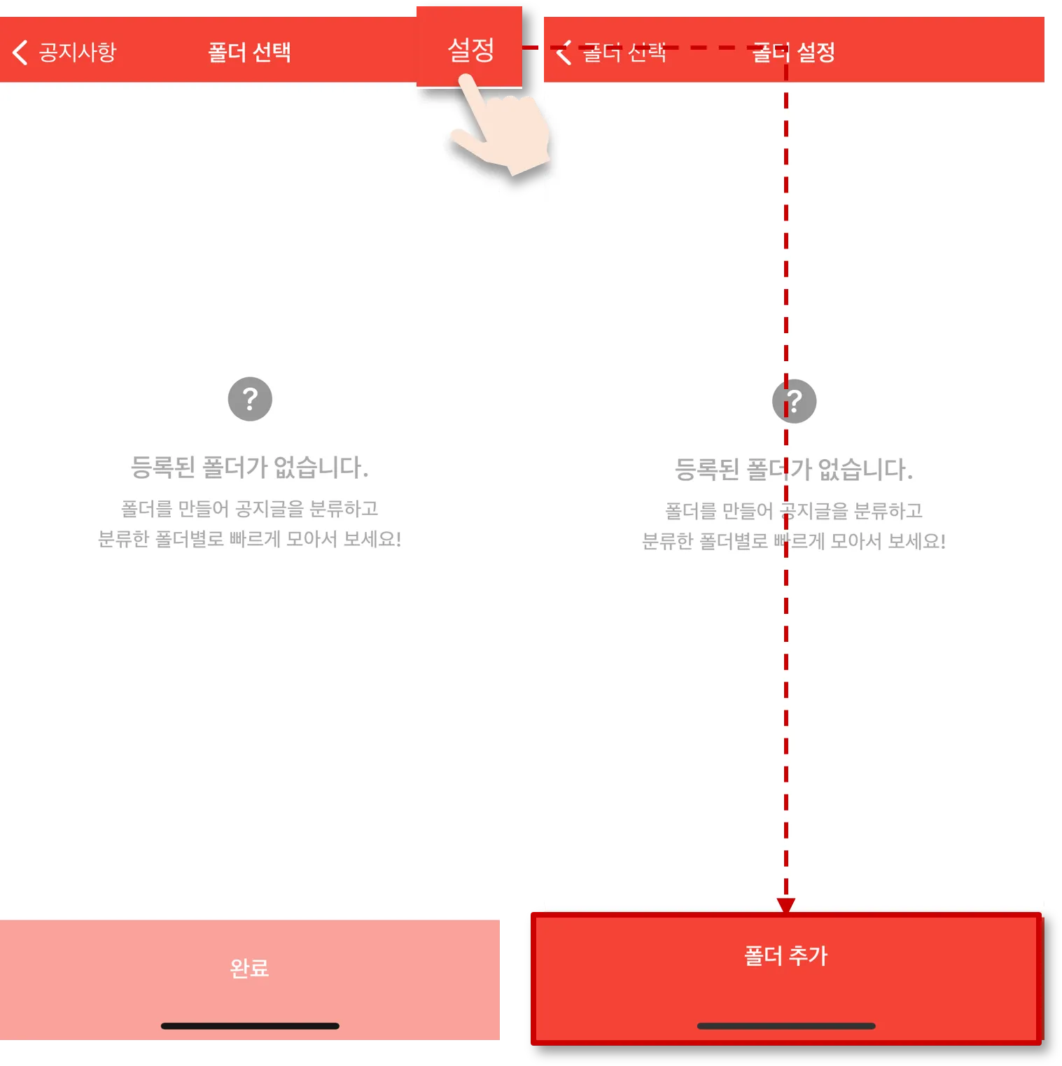 공지사항 상단에 폴더 목록이 보여지고, 옆으로 스크롤 시 추가된 모든 폴더 목록을 확인할 수 있습니다.