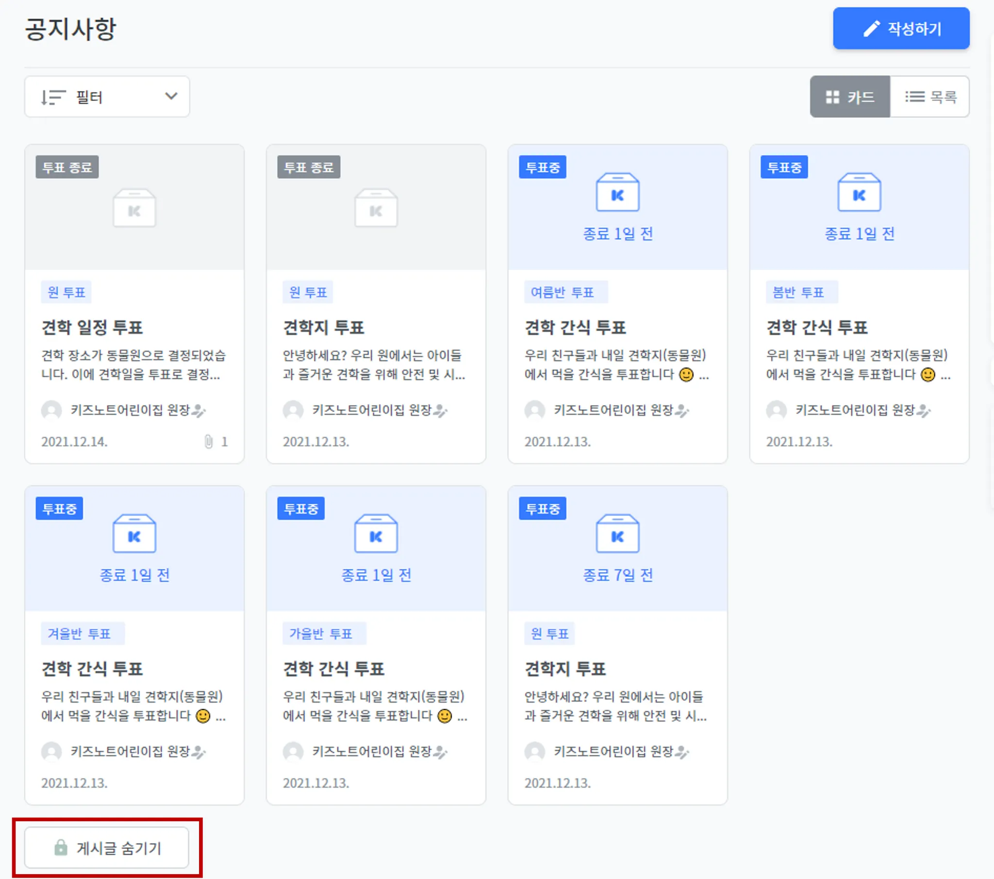게시물 숨기기기능으로 이전에 작성된 공지 대상과 작성 기간을 선택해 '비공개 게시물 보관함'으로 이동시켜 원장님 이외의 멤버에게 비공개 시킬 수 있습니다.