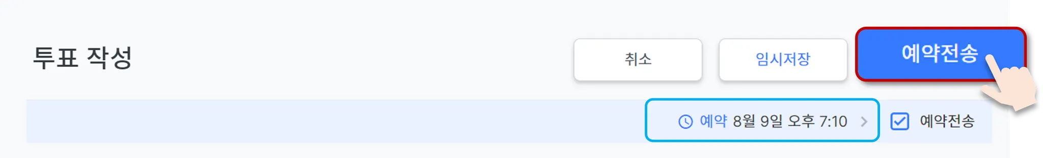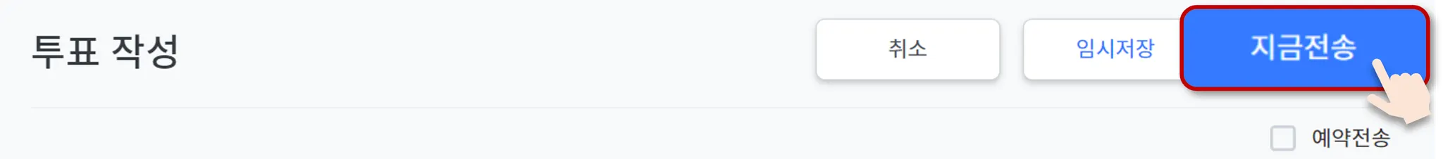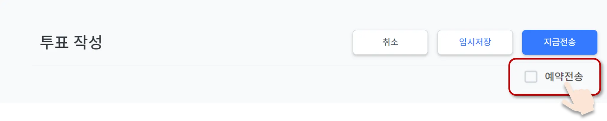 작성한 투표를 예약발송 하려면, 우측 상단의 예약전송 버튼을 눌러주세요.