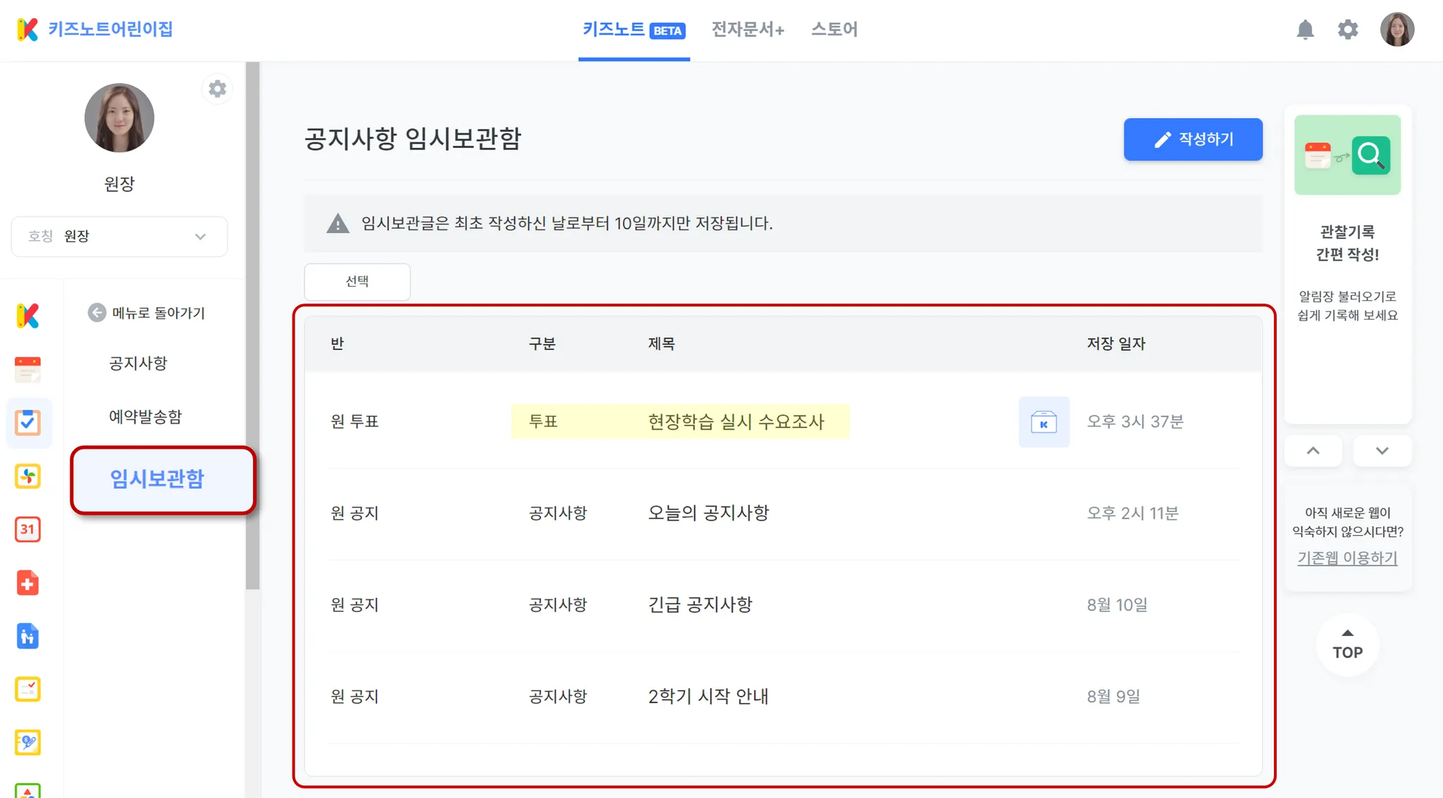 키즈노트 Web에서 공지사항 메뉴를 선택합니다.