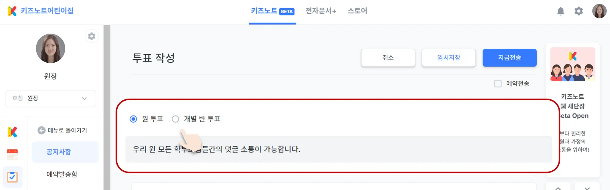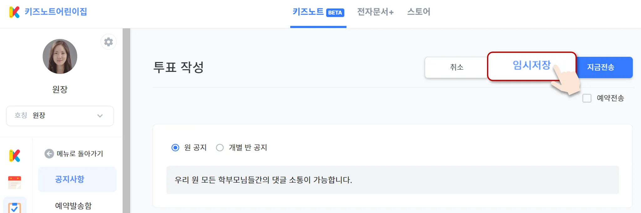 - 댓글 허용 : 투표 댓글 허용 여부를 선택할 수 있습니다. 댓글 작성 시 해당반 선생님, 원장님 계정으로 알림이 갑니다.