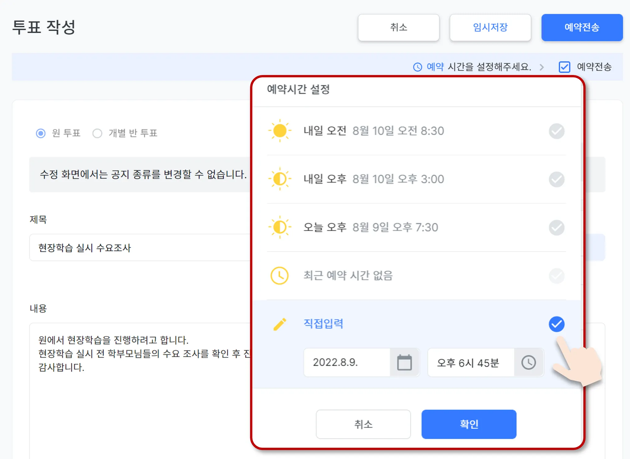 예약시간을 설정해주세요. 직접입력을 선택하면 해당 투표 글을 전송할 시간을 직접 설정할 수 있습니다.