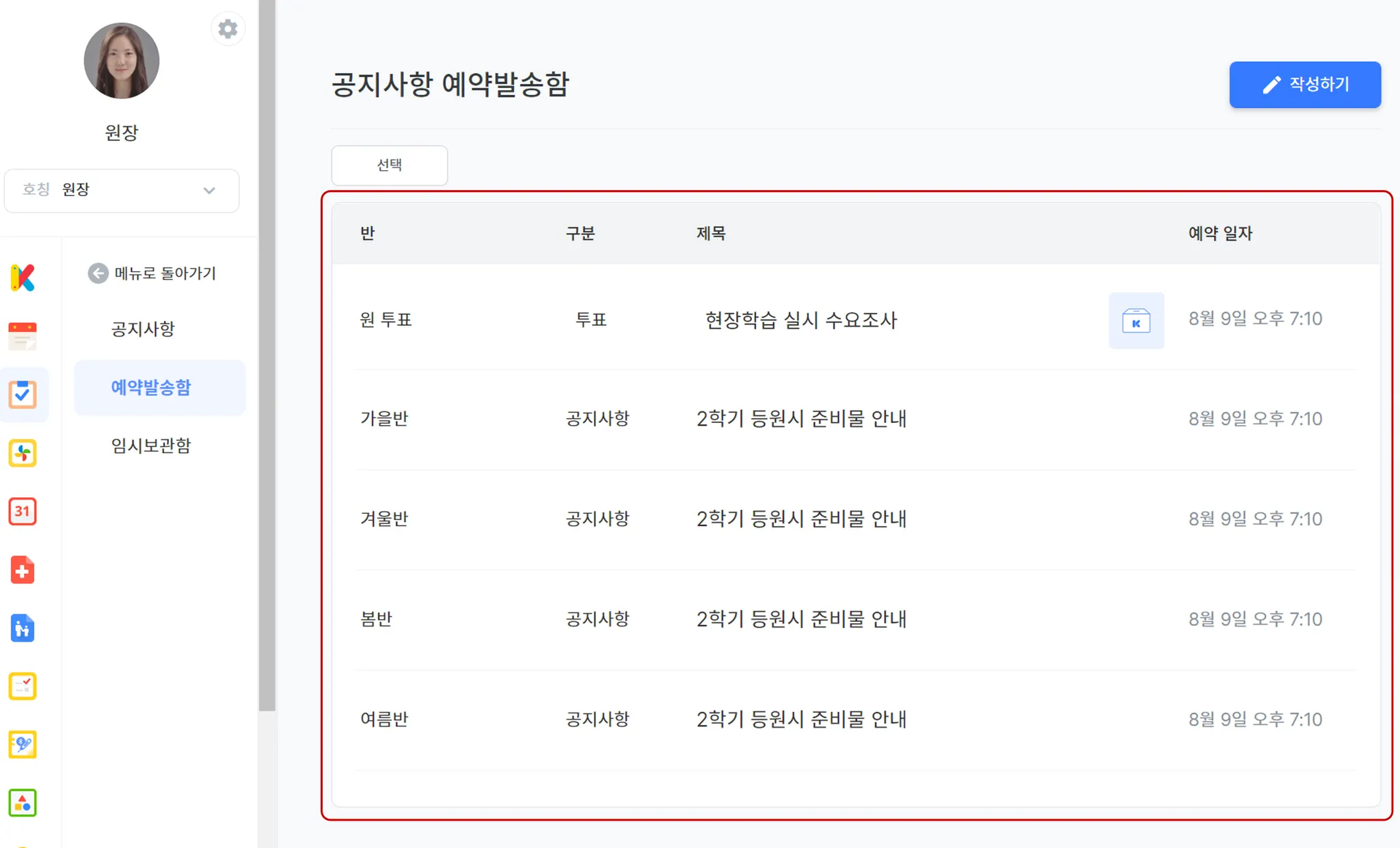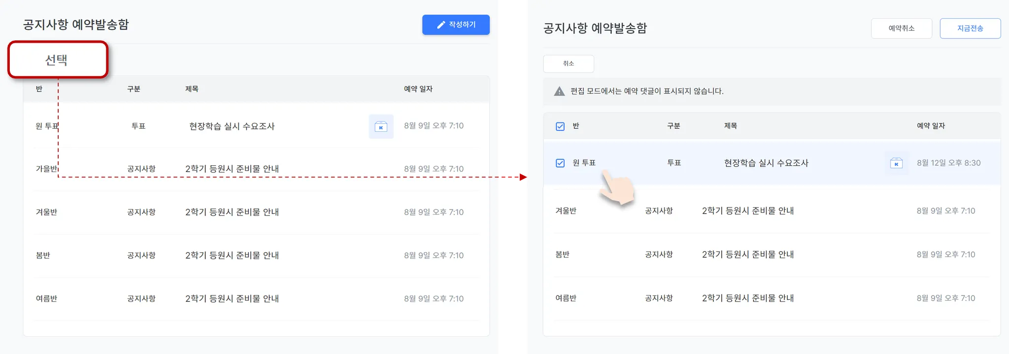 예약전송을 선택하면 공지사항 예약발송함으로 이동하며, 목록에는 반, 구분, 제목, 예약 일자가 나타납니다.