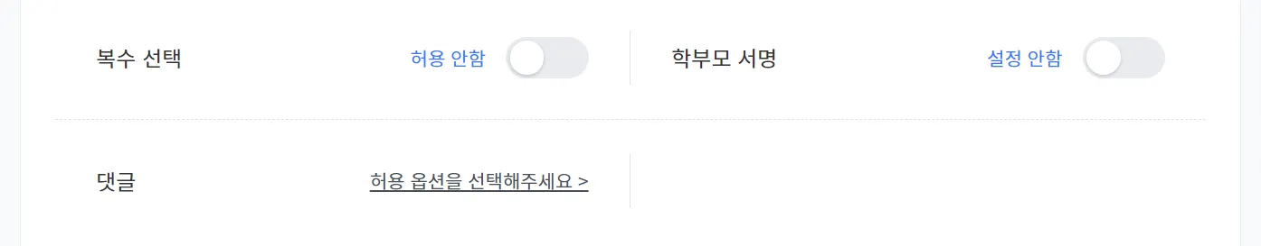 필요에 따라 복수선택, 학부모 서명기능을 선택하여 켜거나 끌 수 있습니다.