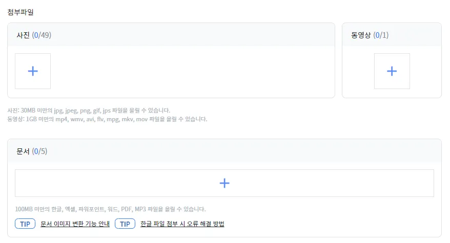 - 첨부파일 개수 : 사진 최대 50장, 동영상 1개 (단, 동영상과 동시 업로드 시 사진은 최대 49장까지 업로드 가능)