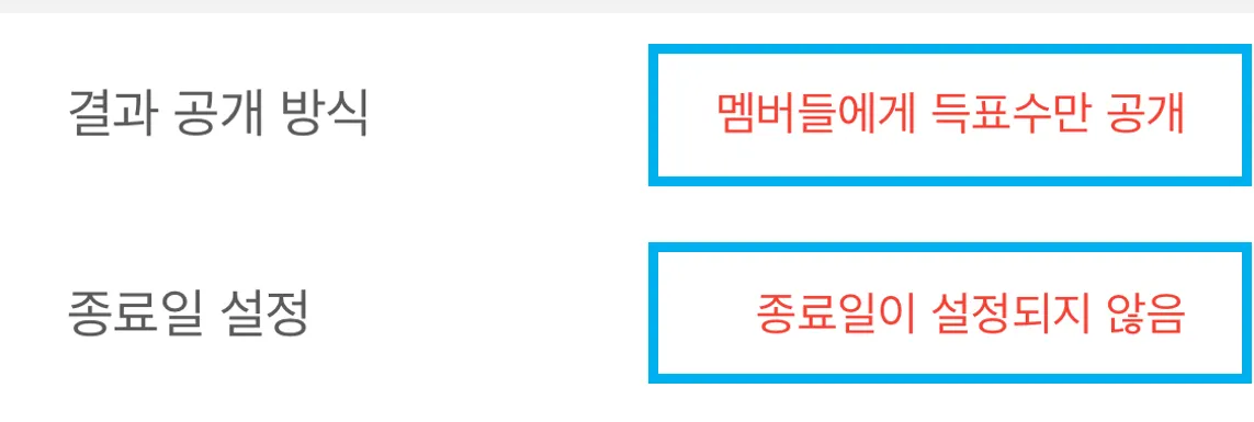 투표 결과공개방식 3가지 중 1가지를 선택하고, 종료일 설정 옵션을 선택해주세요.