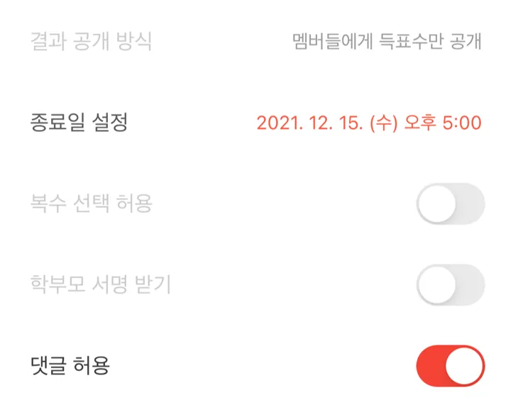 - 댓글 허용 : 투표 댓글 허용 여부를 선택할 수 있습니다. 댓글 작성 시 해당반 선생님, 원장님 계정으로 알림이 갑니다.
