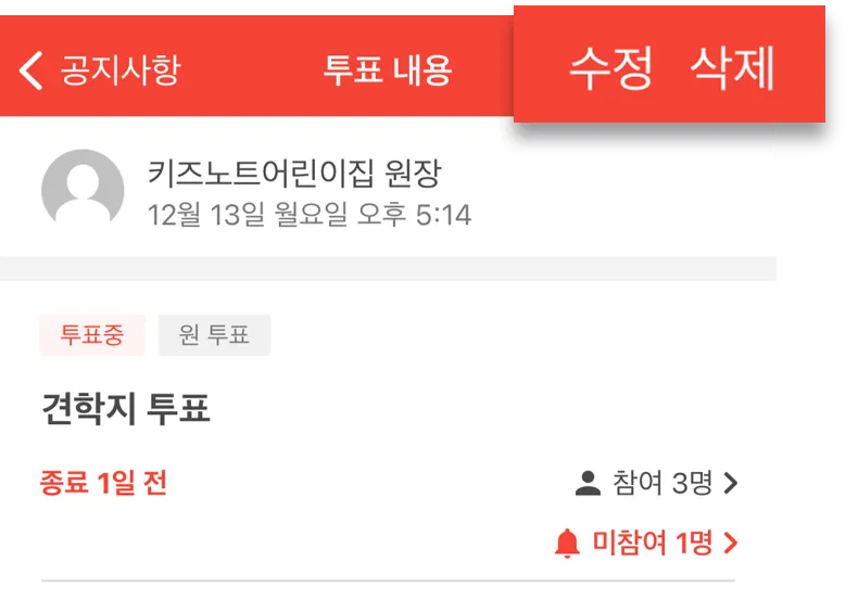 - 투표 수정시 별도의 알람이 전송되지 않습니다.