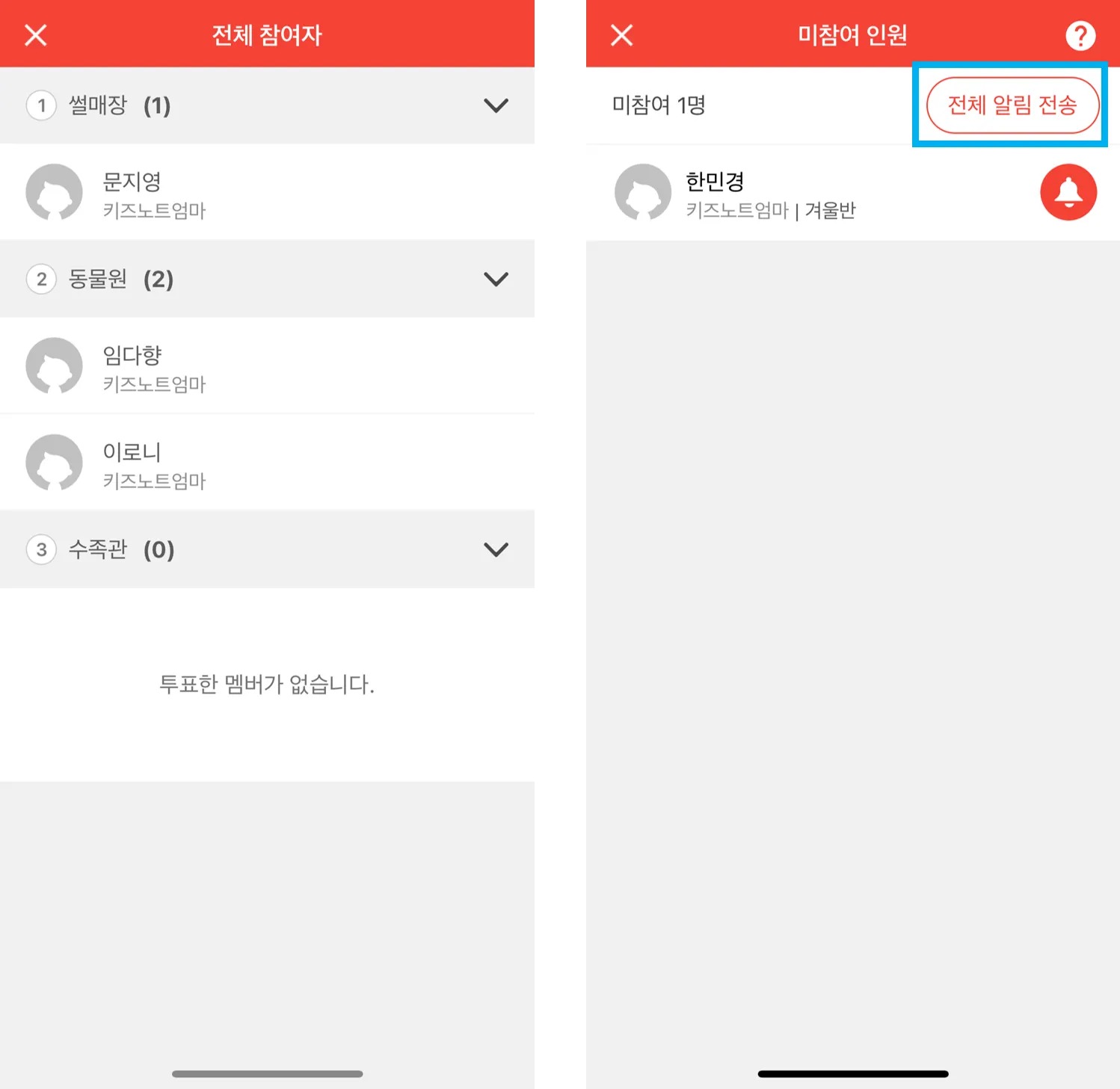 진행 중인 투표에서 참여/미참여 멤버를 확인할 수 있고, 미참여 멤버에게 알림 전송 기능으로 투표에 꼭 참여하실 수 있게 리마인드 알림을 발송할 수 있습니다.