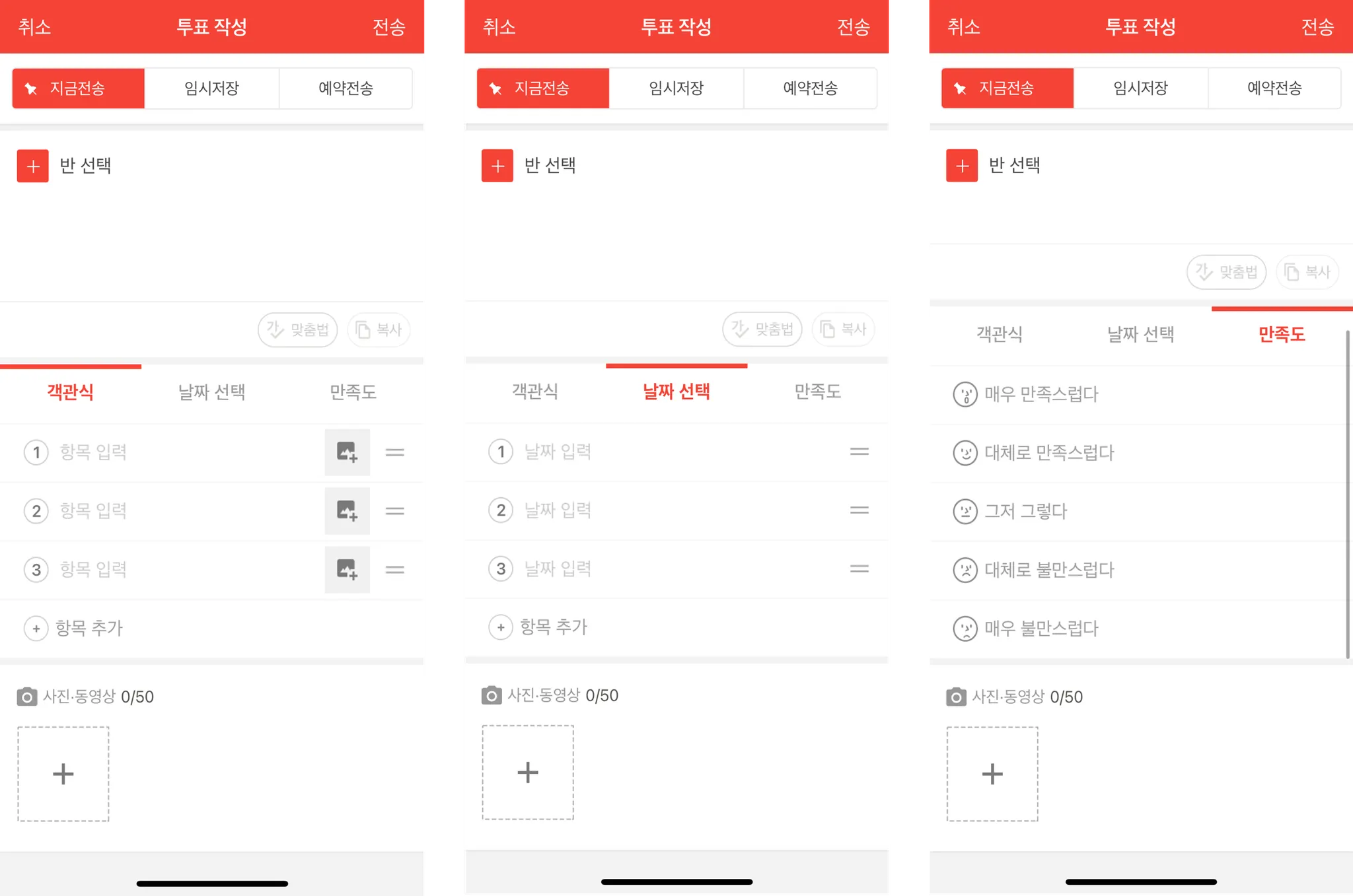 - 객관식 : 투표 항목을 직접 입력하여 설정 할 수 있습니다.