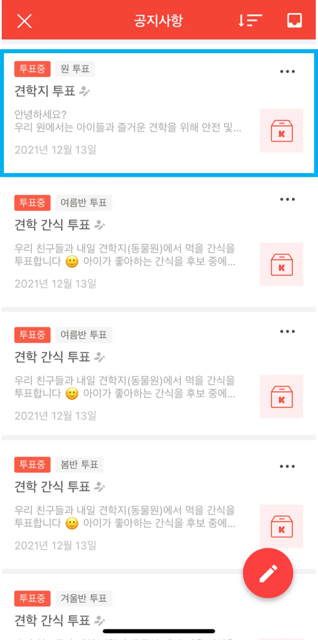 - 공지사항 목록에는 원 투표와 개별 반 투표를 모두 볼 수 있고, 진행 중인 투표와 종료 된 투표를 볼 수 있습니다.