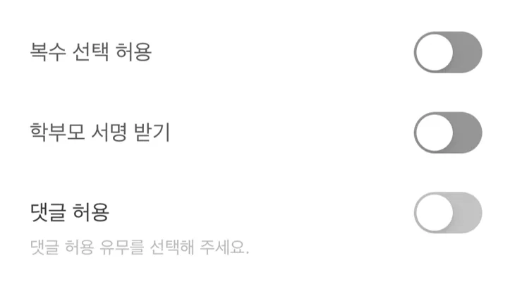 필요에 따라 복수선택, 학부모 서명기능을 선택하여 키거나 끌 수 있습니다.