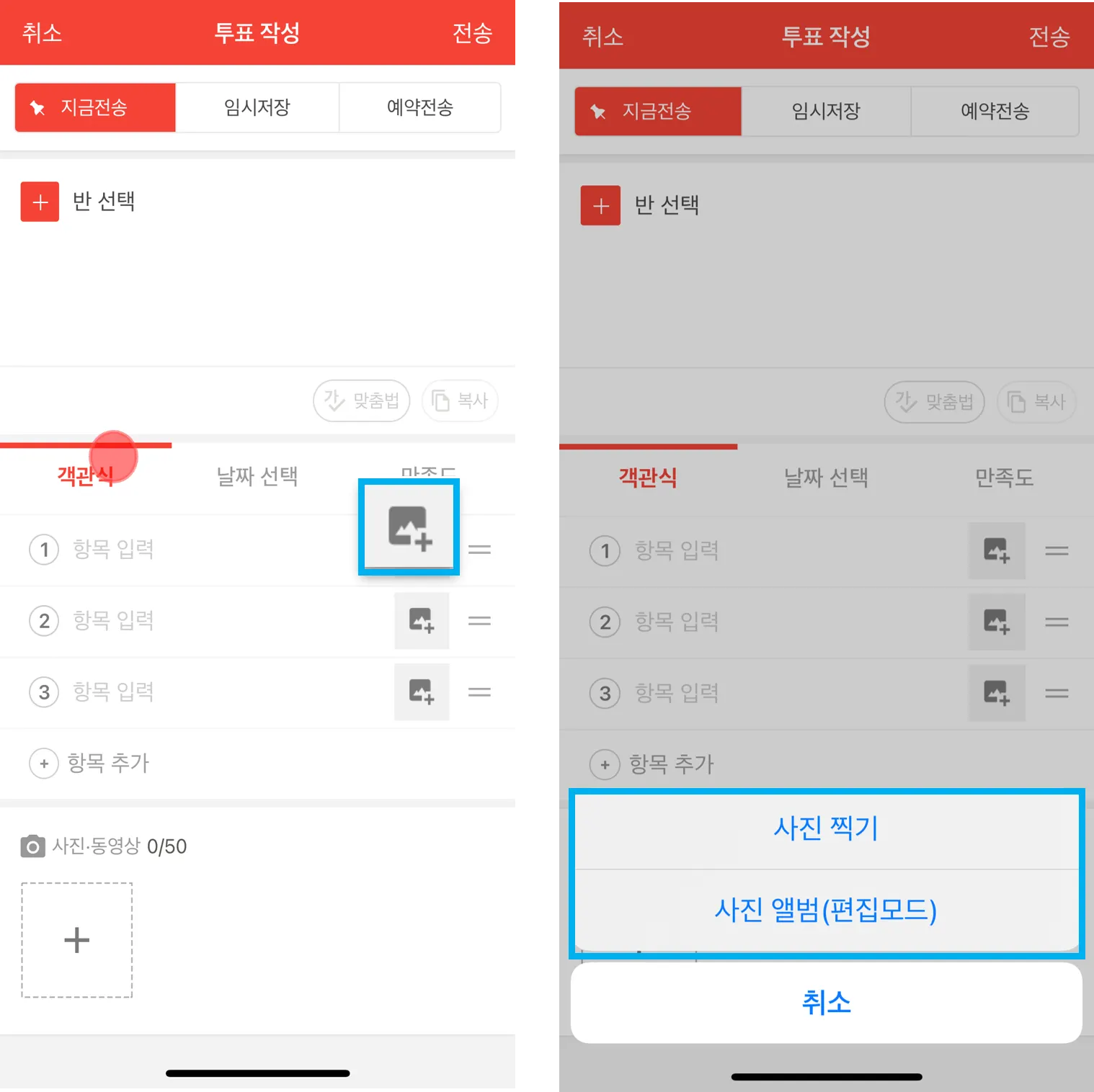 객관식 항목에서는 투표 사진을 첨부할 수 있습니다. 투표 사진 첨부 기능으로 투표 내용을 쉽게 이해하고, 간편하게 투표할 수 있습니다.