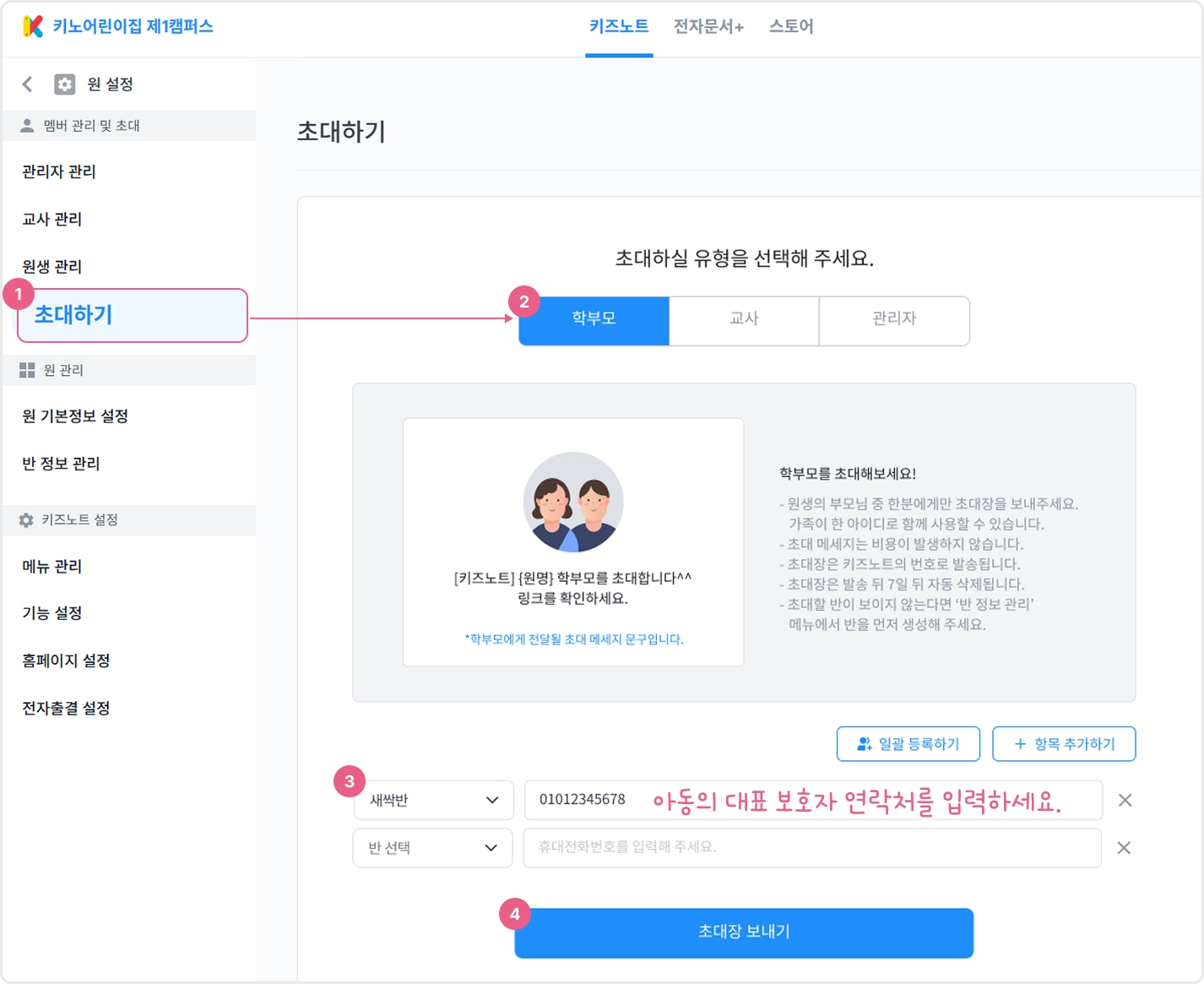 원장님과 선생님은 아동의 보호자 연락처를 입력하여 기관 초대장을 보낼 수 있습니다.
