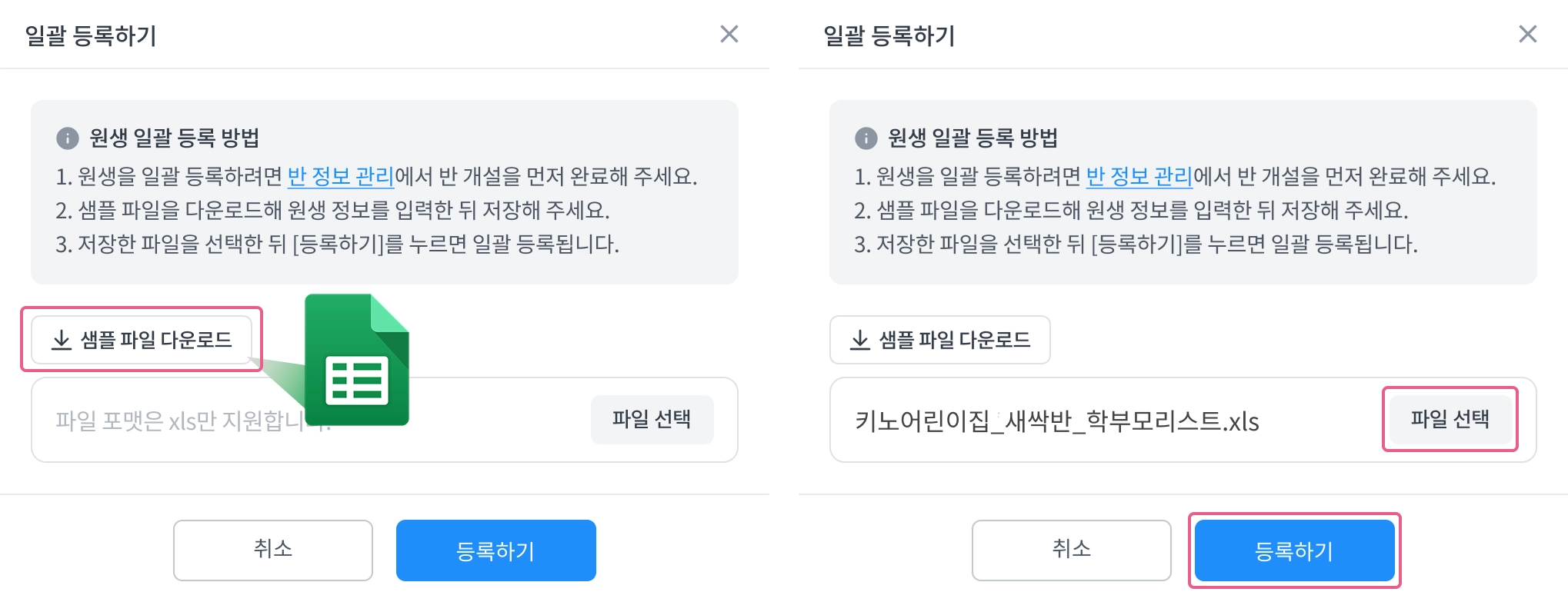 샘플 파일 다운로드 클릭 > 엑셀 파일 양식에 맞게 보호자 연락처 기재 후 파일 저장