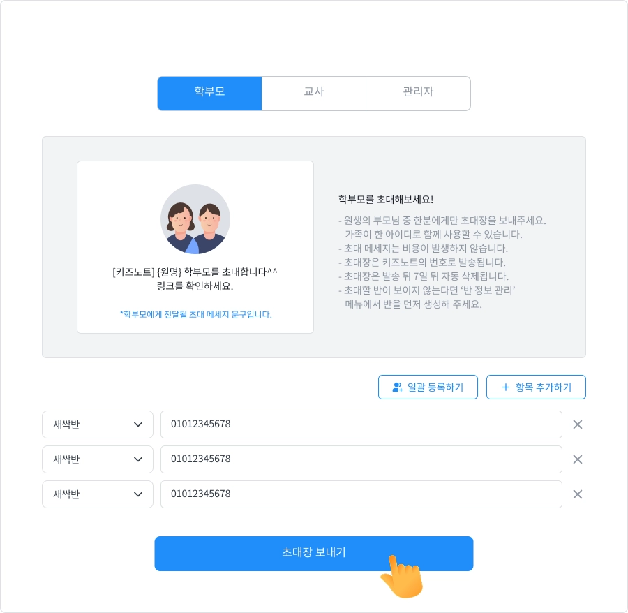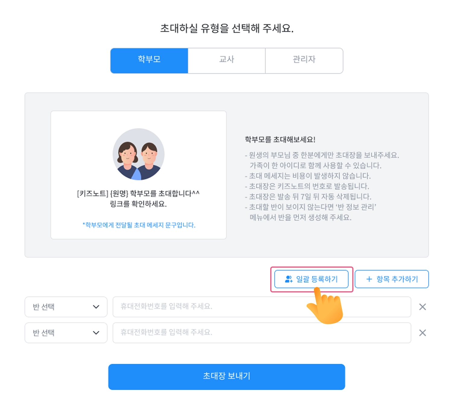 초대할 학부모가 많은 경우에는 PC에서 초대장 일괄 발송이 가능합니다.