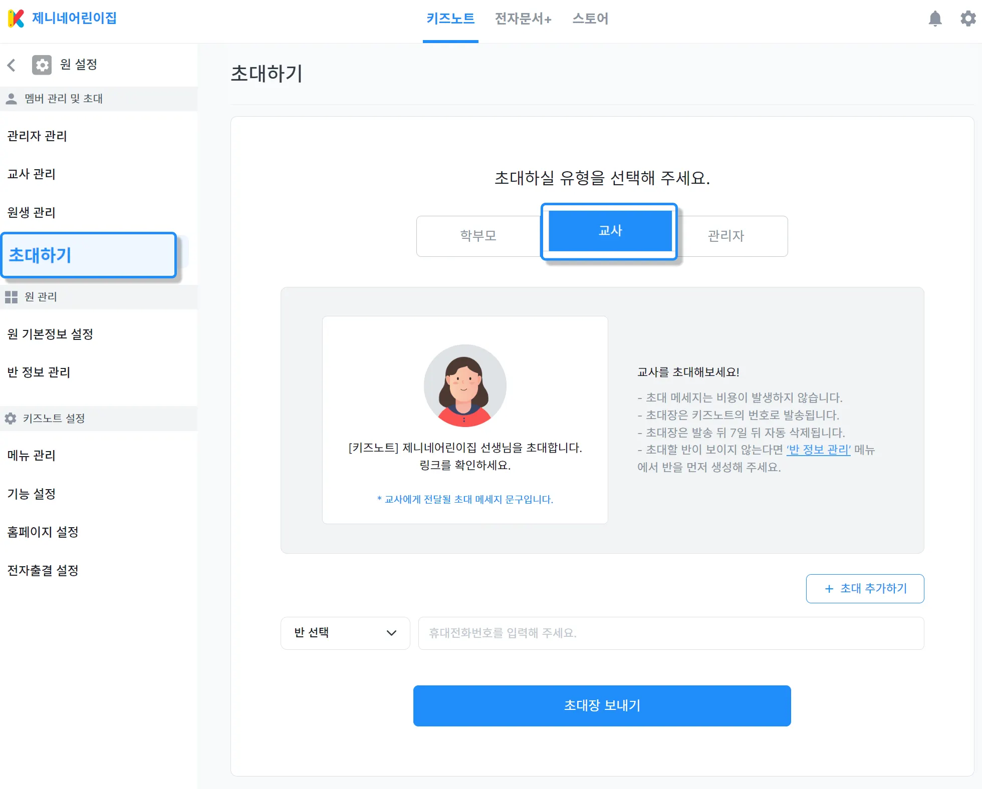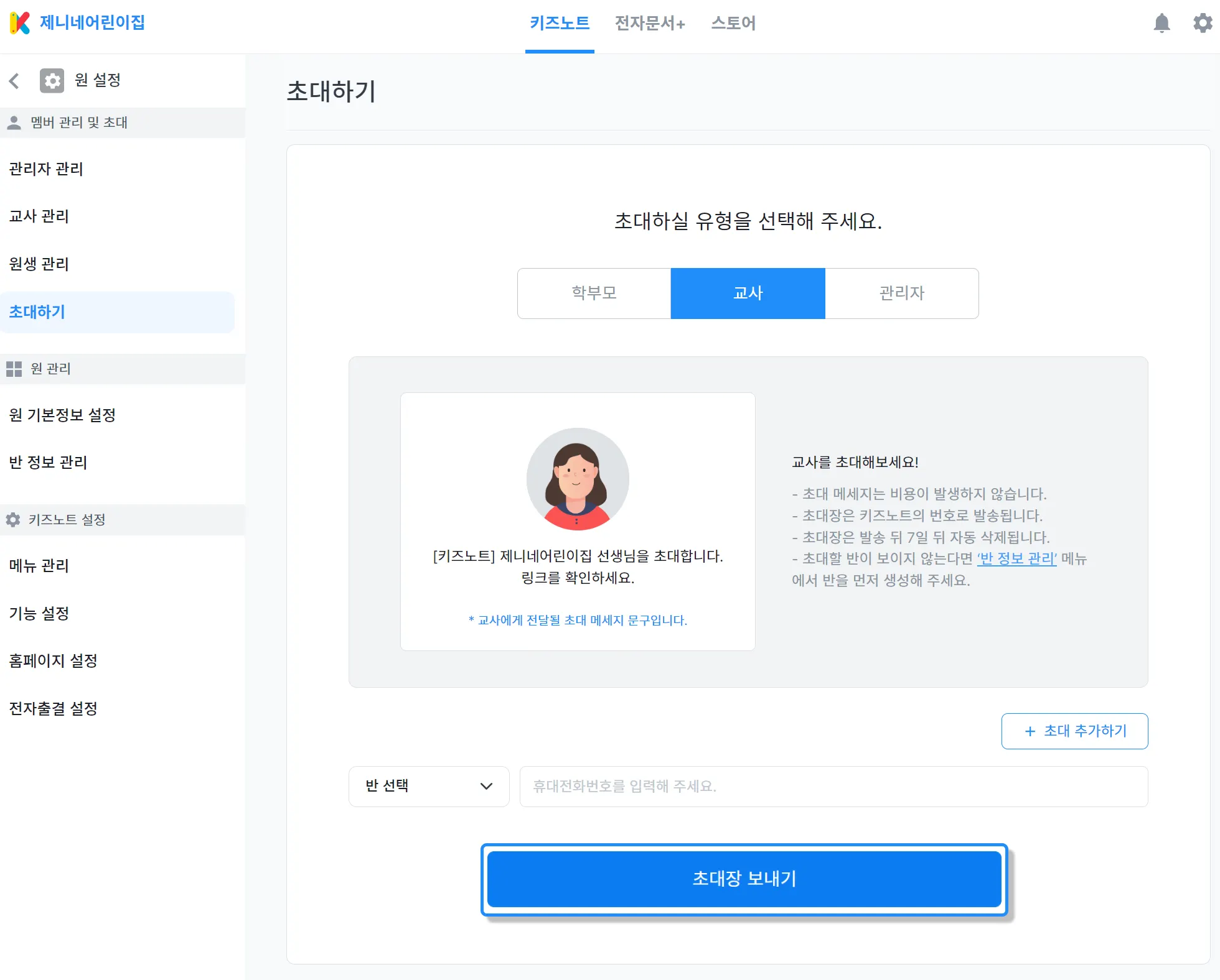 초대 할 선생님의 소속 반을 선택 후 휴대전화번호를 입력한 뒤 초대장 보내기를 클릭하여 초대장을 보낼 수 있습니다.