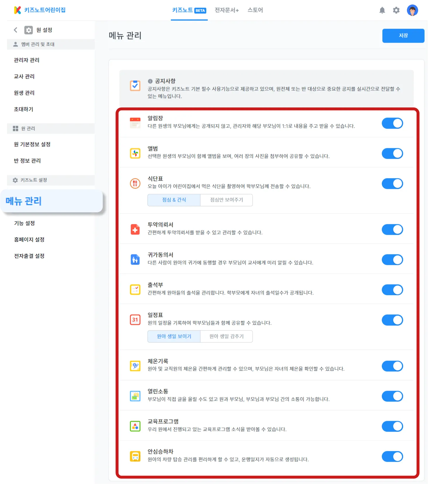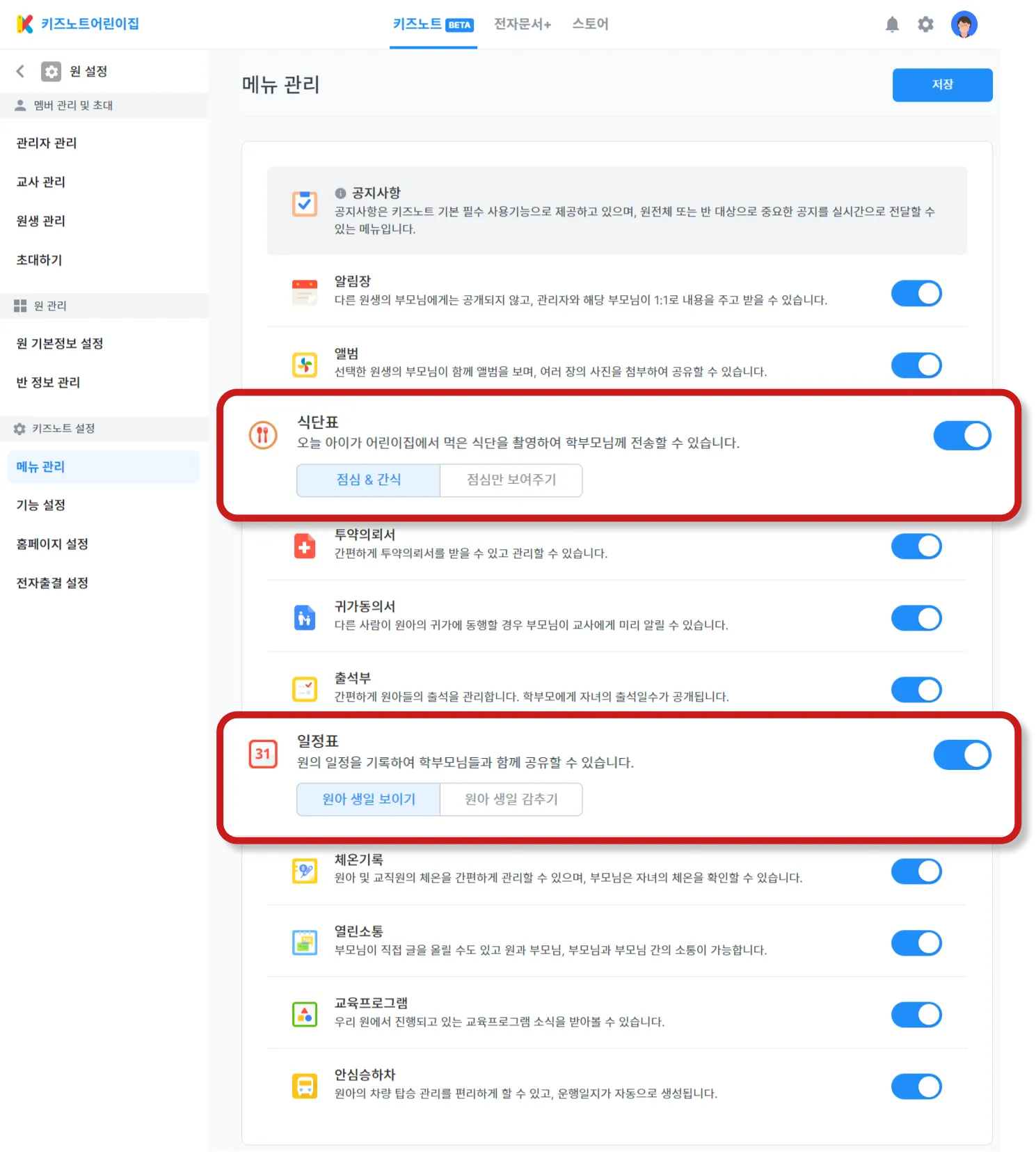메뉴 관리에서 식단표와 일정표는 ‘켜기’ 선택 시 추가 옵션을 선택할 수 있으며, 알림장/투약의뢰서 ‘끄기’ 선택 시 발송이 예약된 게시글 및 댓글이 모두 예약 취소 됩니다.