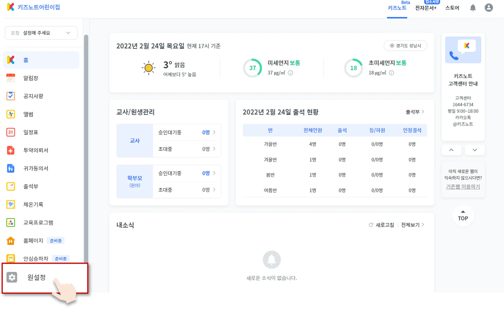 키즈노트 웹사이트에 로그인 후 원 설정을 선택해 주세요.