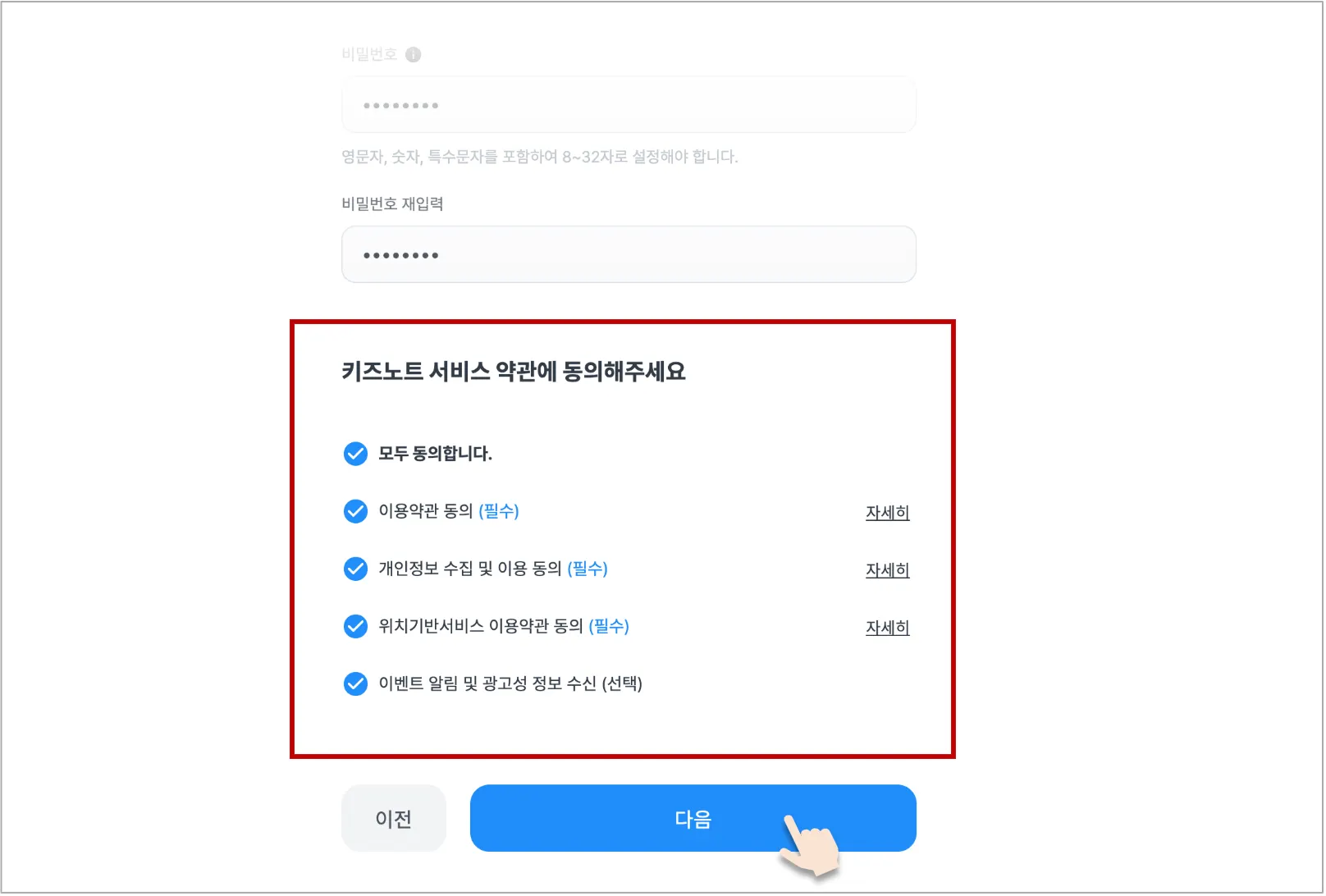 키즈노트 서비스 이용을 위해서는 하단의 이용 약관에 동의가 필요합니다. 이용 약관 동의 선택 후 다음을 눌러주세요.