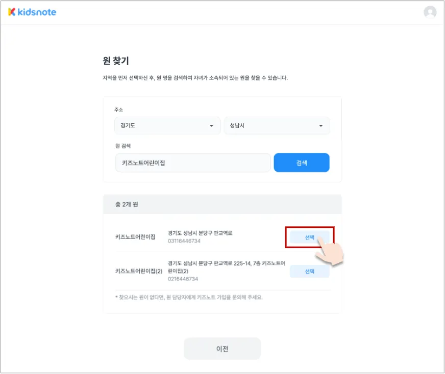 - 만약 찾으시는 원이 없다면, 원장님 혹은 원 담당자에게 키즈노트 가입을 문의해 주세요.