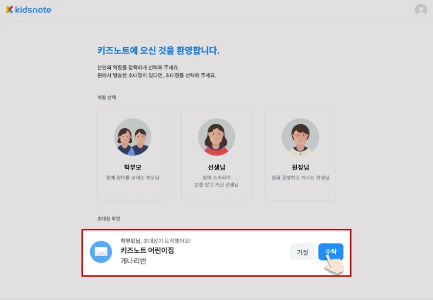 역할등록 페이지 하단의 학부모님 초대장 내용을 확인하시고 수락을 눌러 주세요.