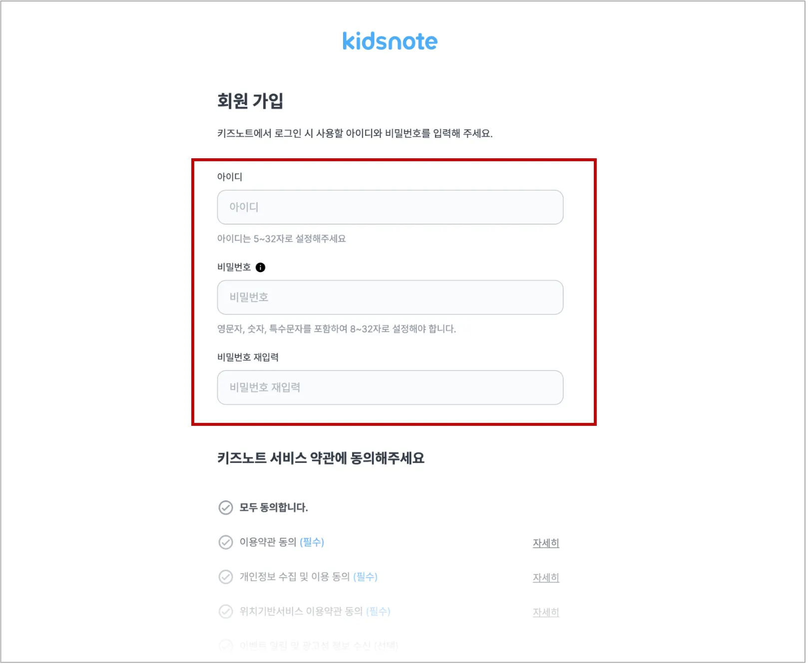 키즈노트에서 사용할 아이디와 비밀번호를 설정해 주세요.