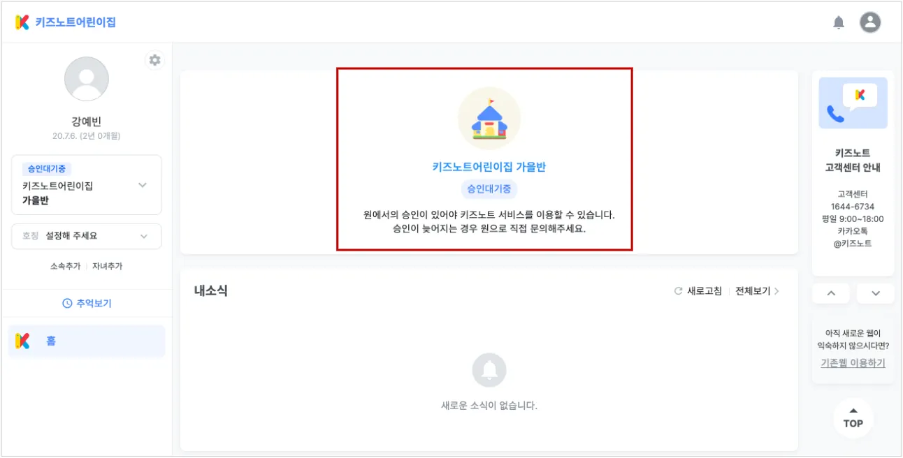 초대로 가입하지 않았기 때문에 승인대기중 표시와 함께 아직 해당 원에서 키즈노트 사용이 되지 않습니다. 원에서 승인을 기다려주세요.