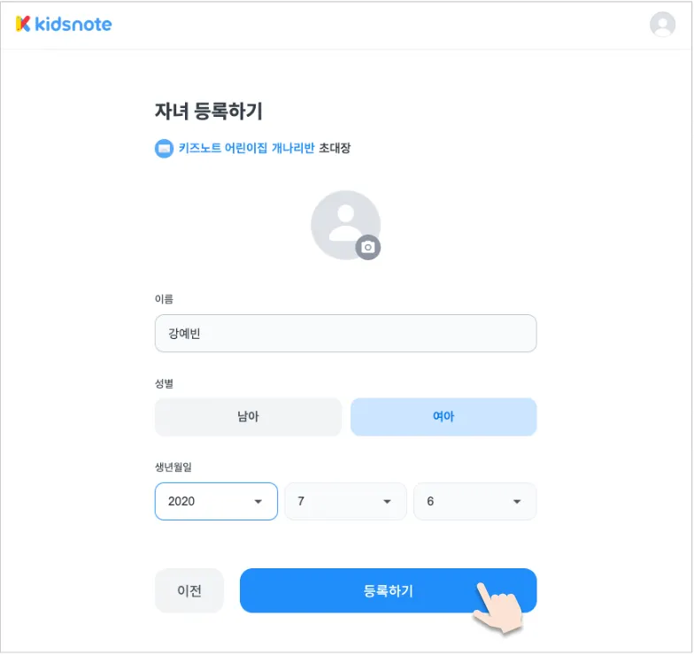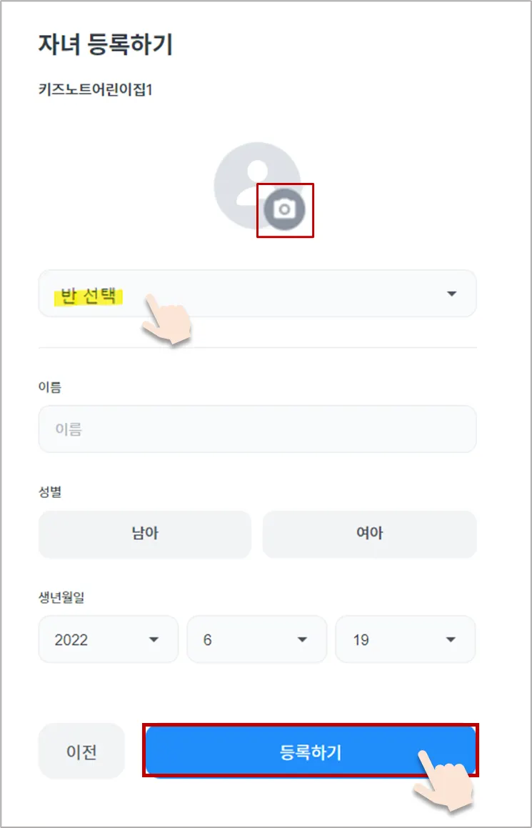 해당 원에서 소속될 반과 노출될 자녀 프로필 사진 및 자녀의 정보를 입력한 후 등록하기를 눌러주세요.