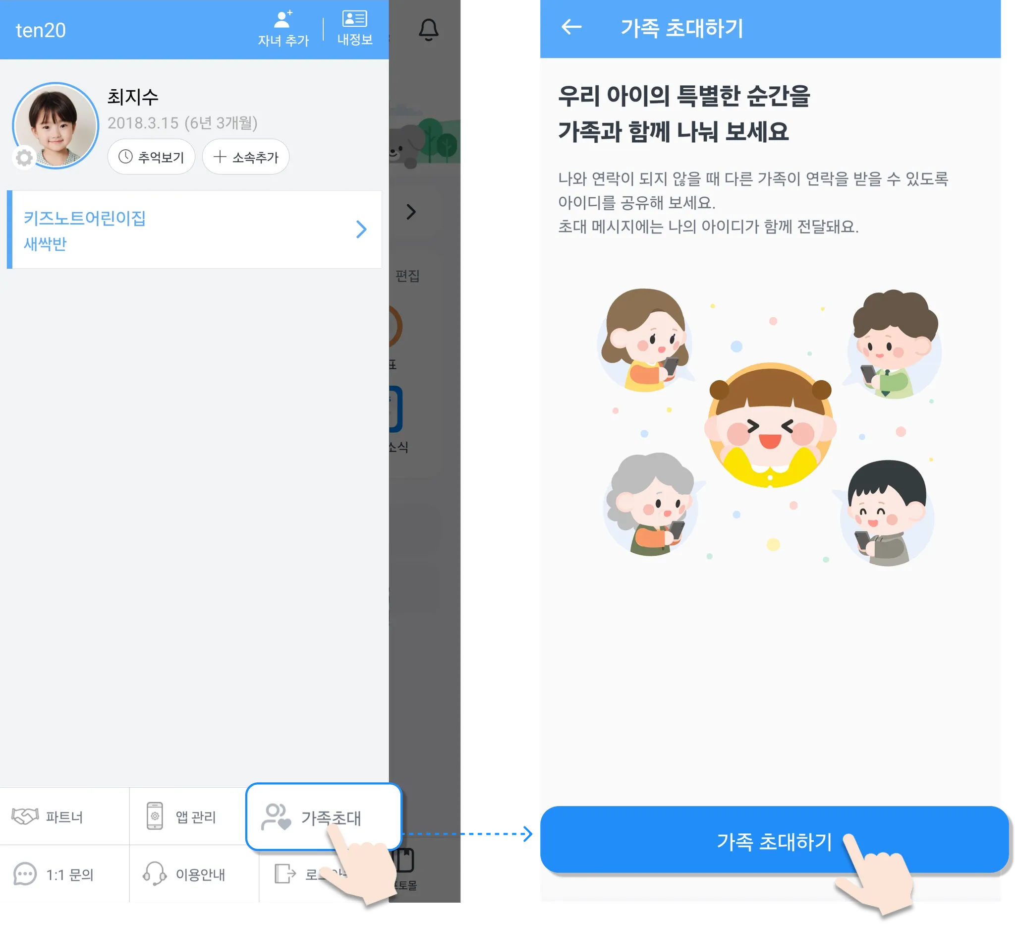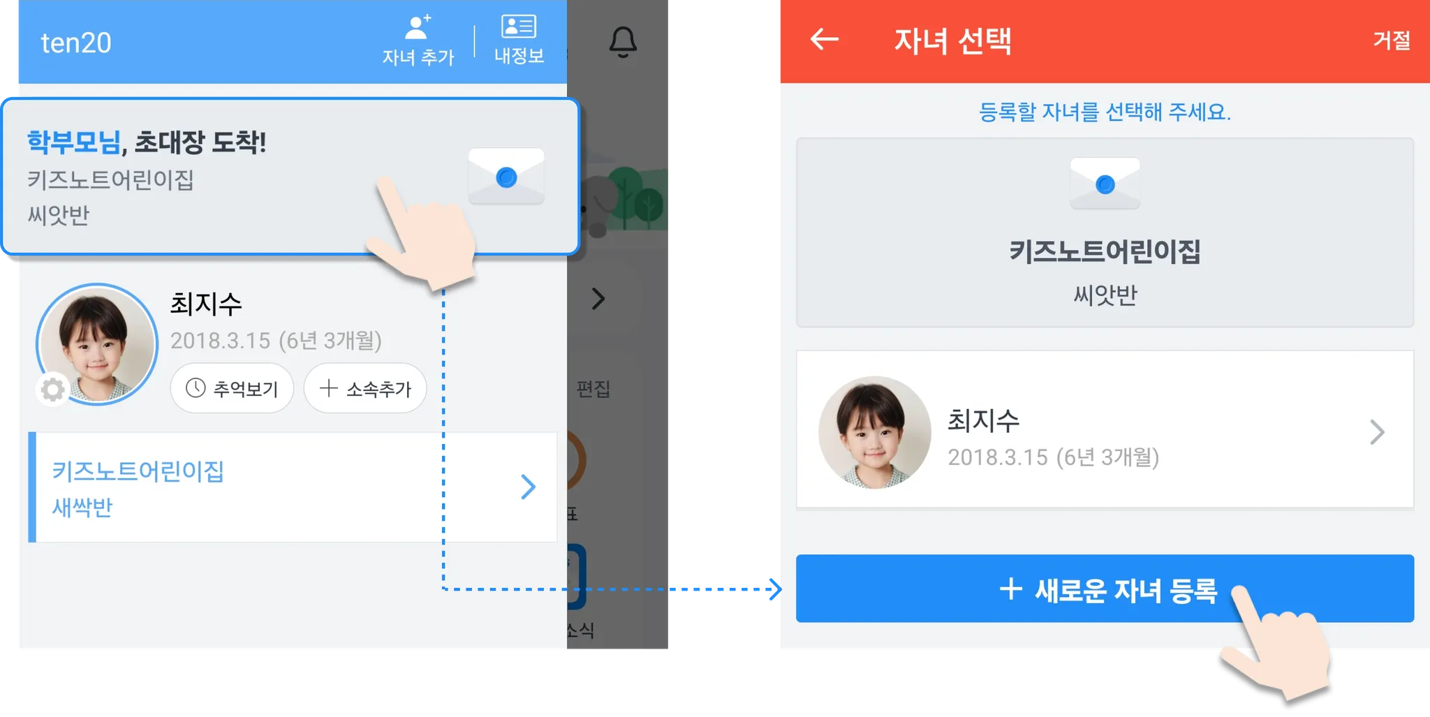 초대장을 누르고, +새로운 자녀 등록을 합니다.