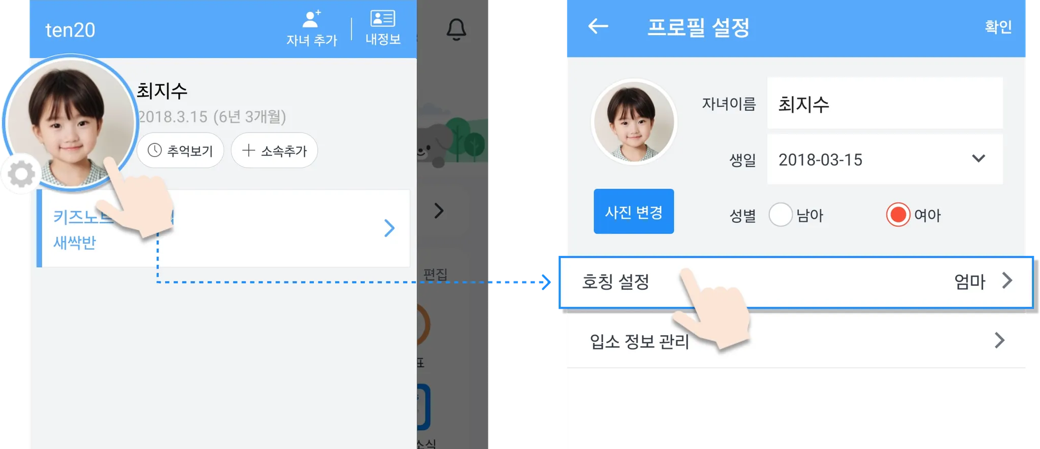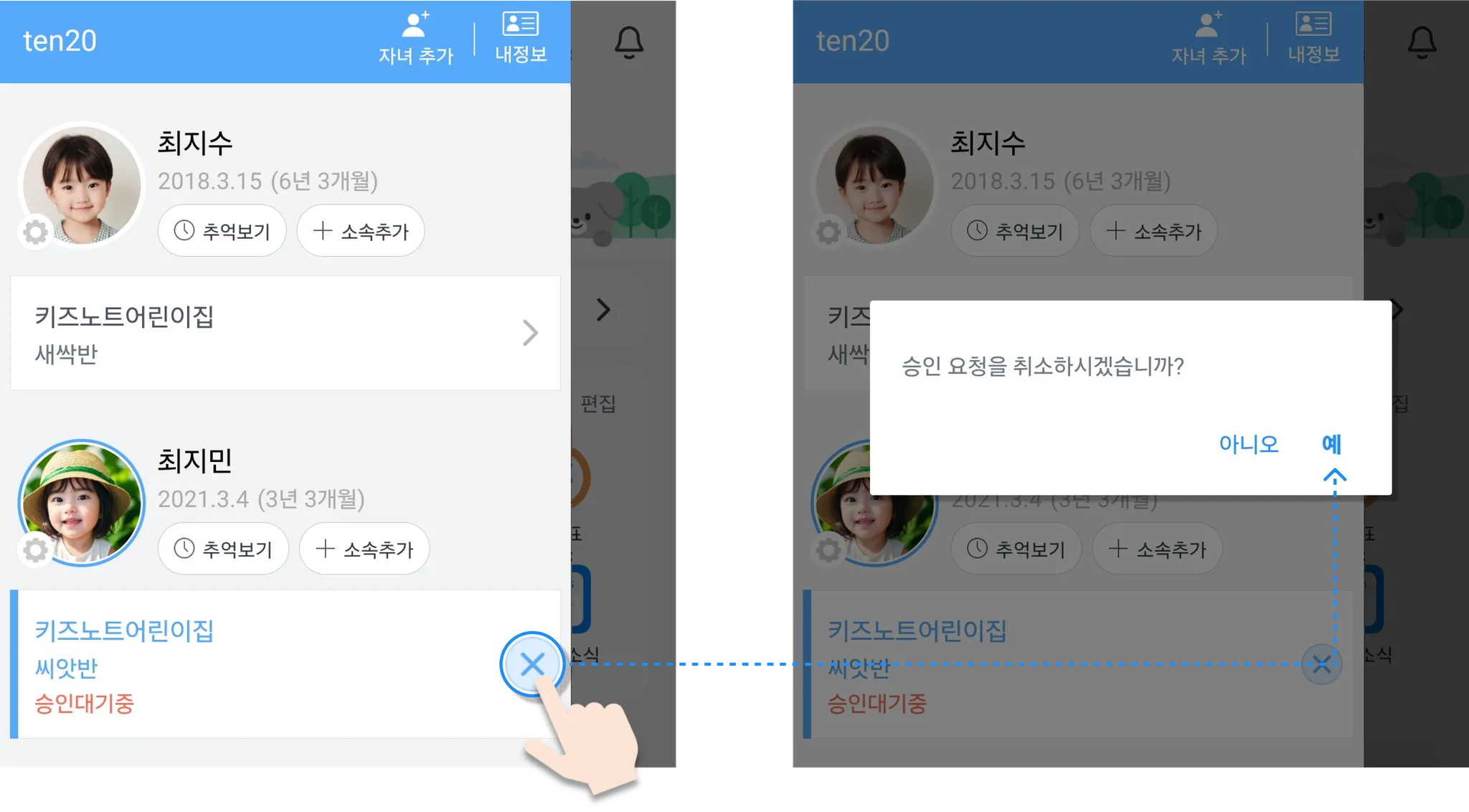 아직 자녀가 원에 소속 등록되기 전에는, 자녀 프로필을 삭제할 수 있습니다.