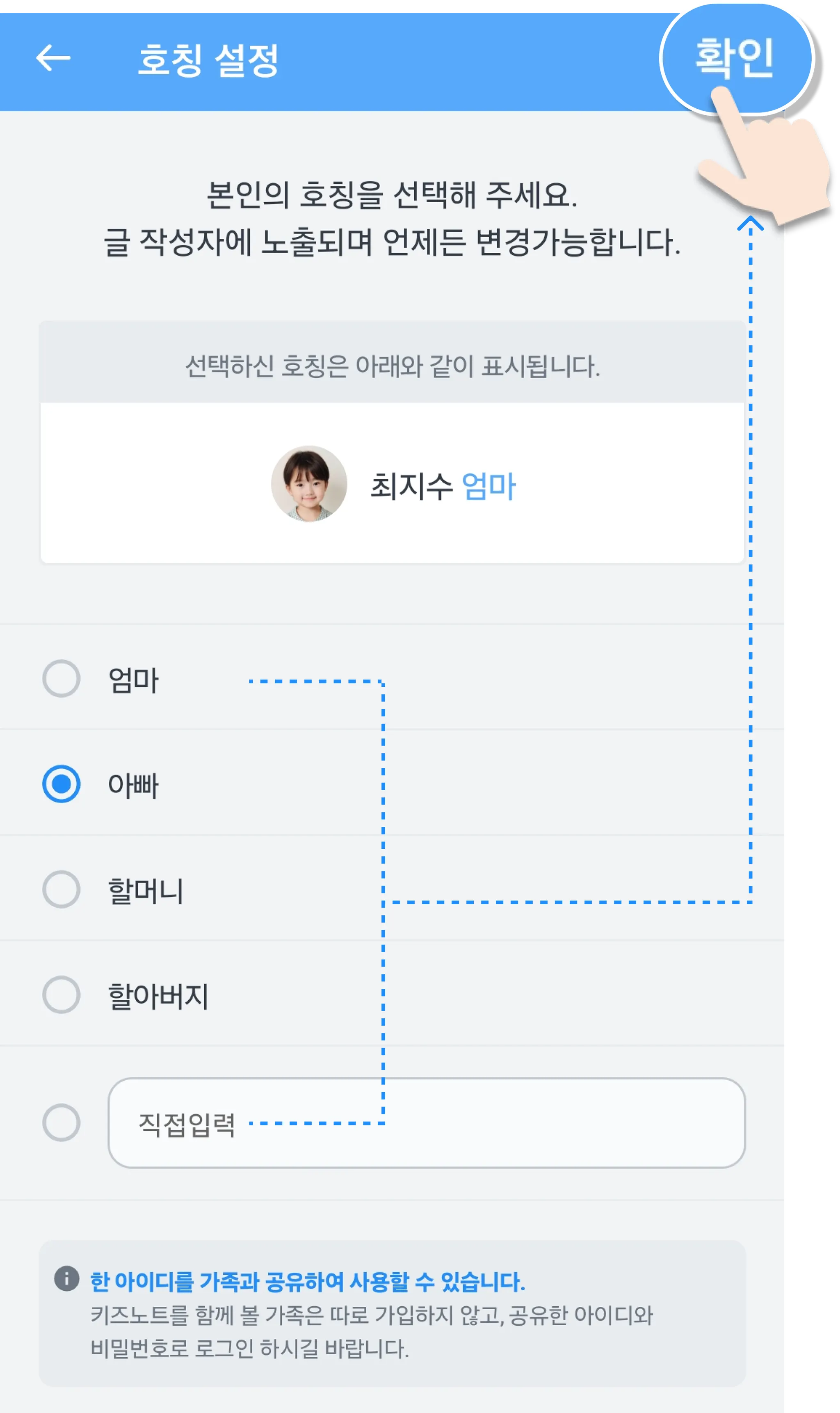 엄마 / 아빠 / 할머니 / 할아버지 / 직접 입력 중 본인에게 맞는 호칭을 설정하고 확인을 누르면, 끝!