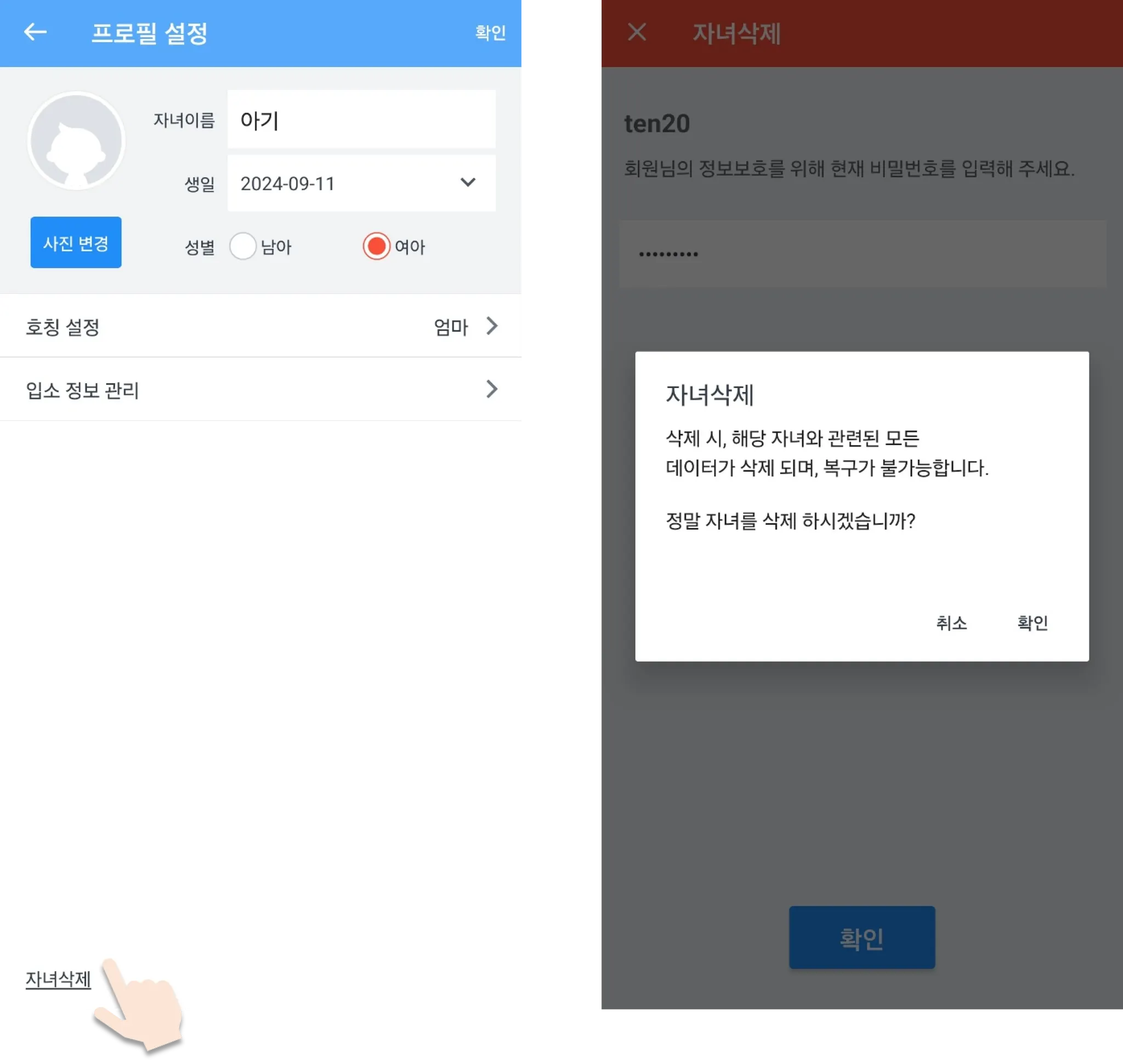 자녀 프로필 삭제 시, 해당 자녀와 관련된 모든 데이터가 삭제되며 복구가 불가능합니다.