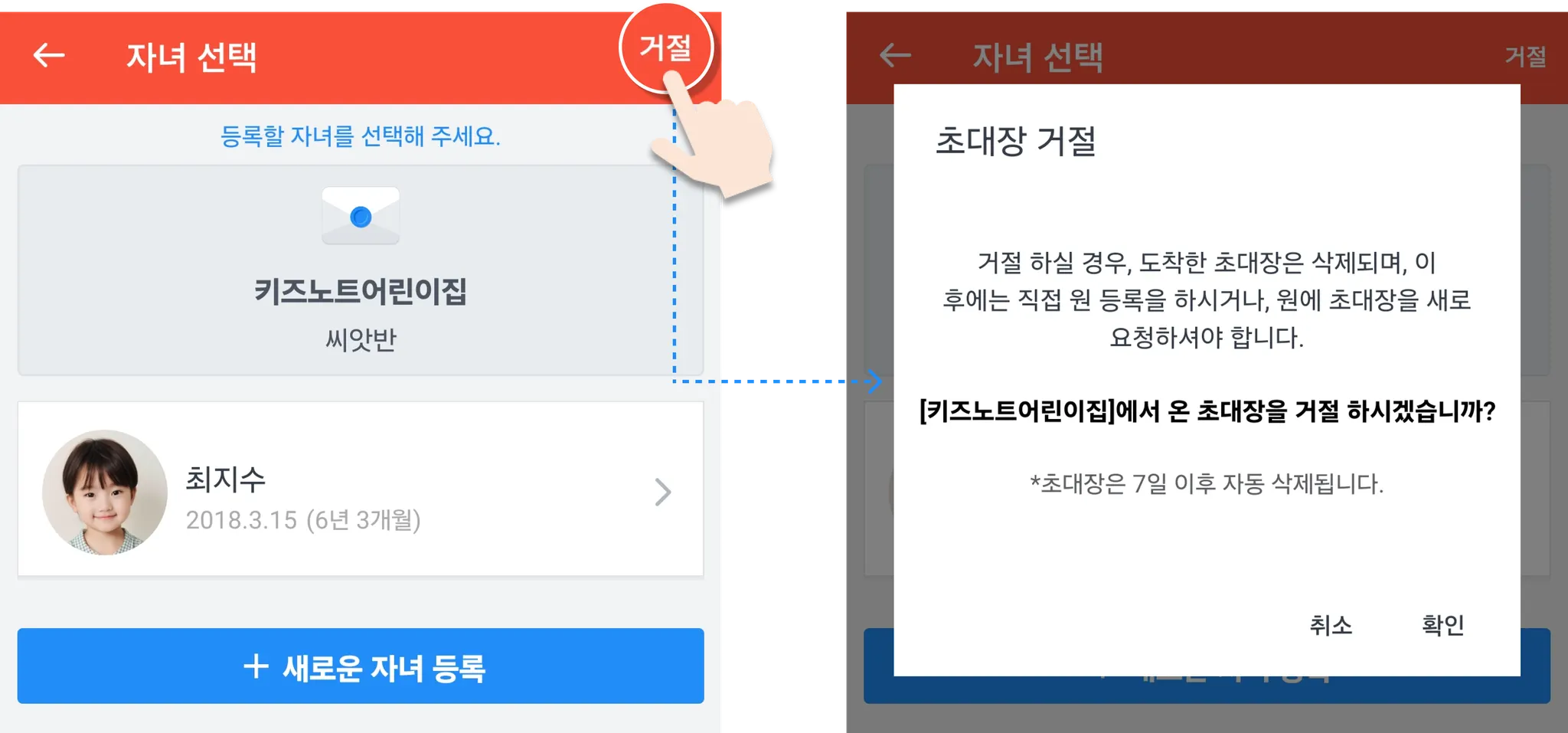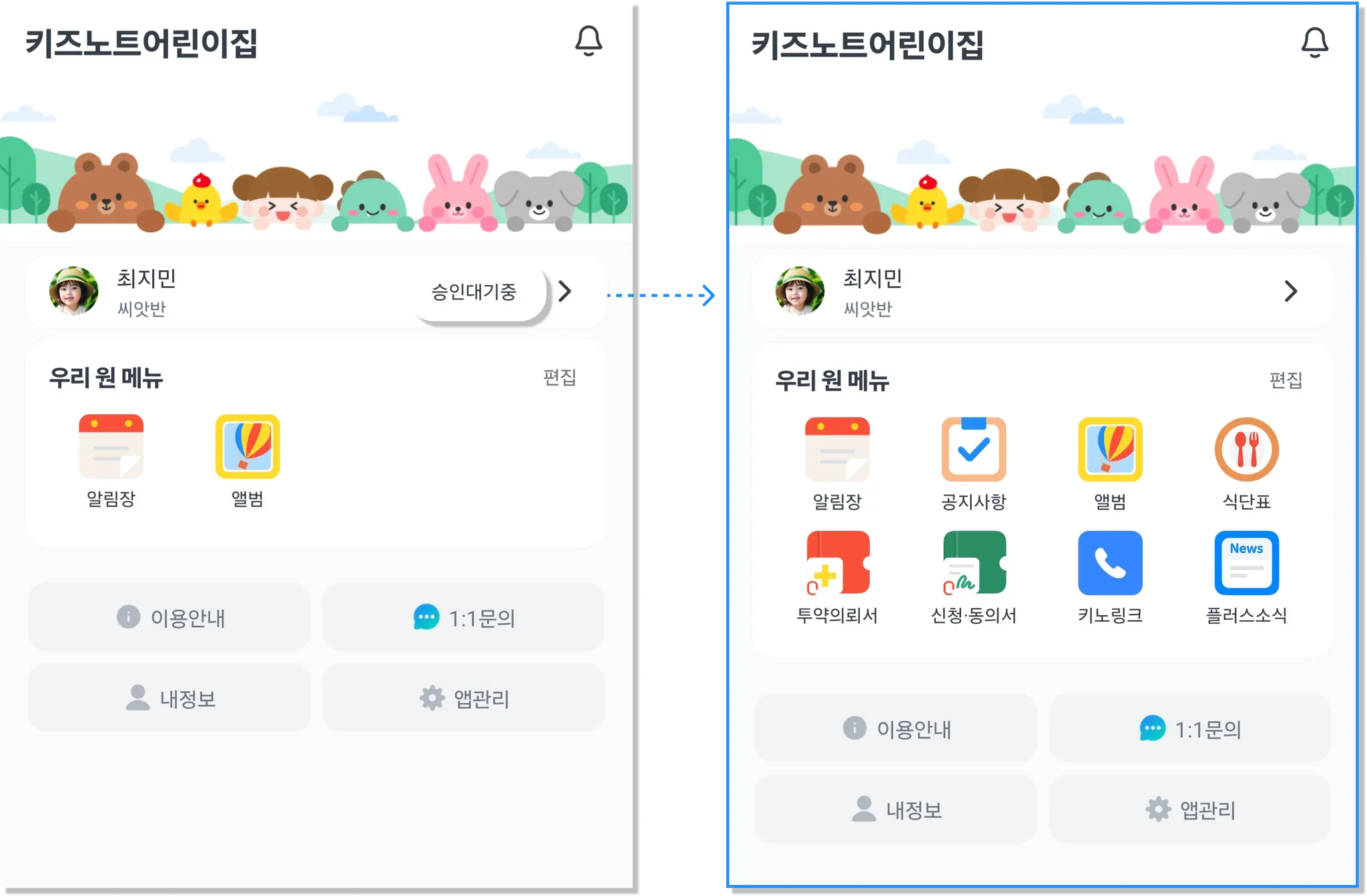 초대장을 통해 자녀를 추가한 경우, 원의 승인없이 바로 키즈노트 이용이 가능합니다!