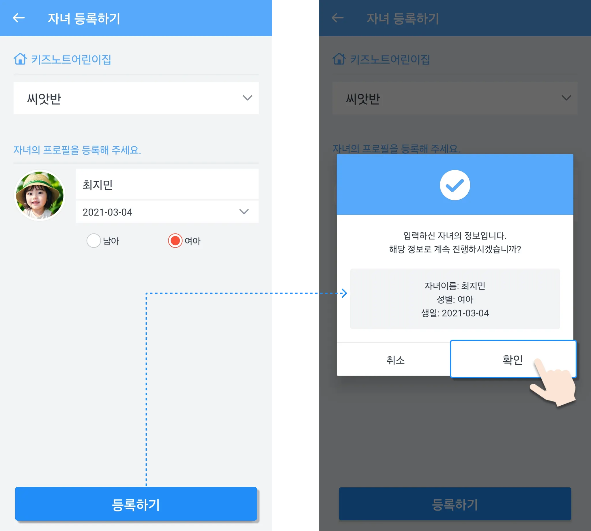 입력한 자녀 정보를 확인 후, 확인버튼을 눌러 주세요.